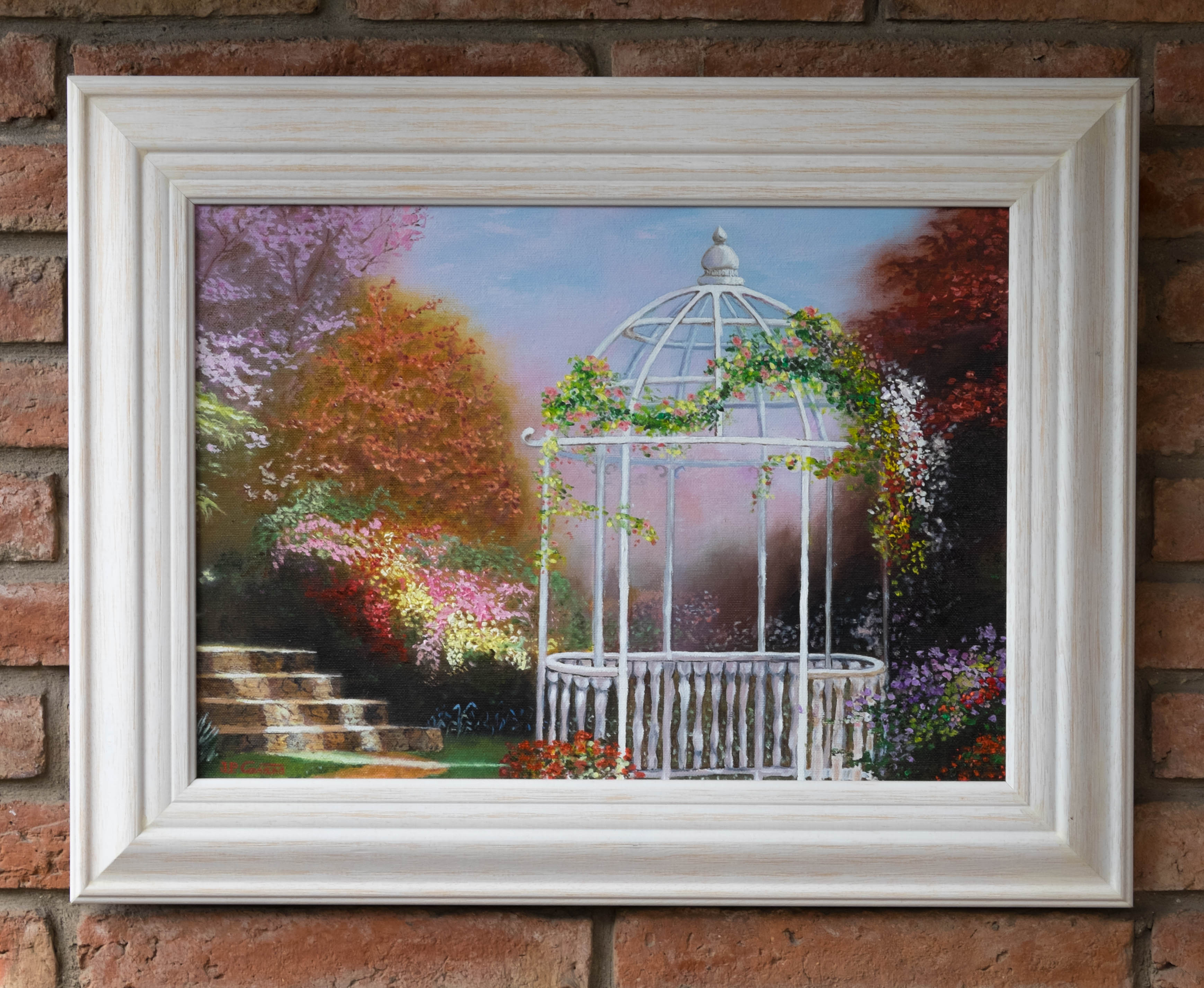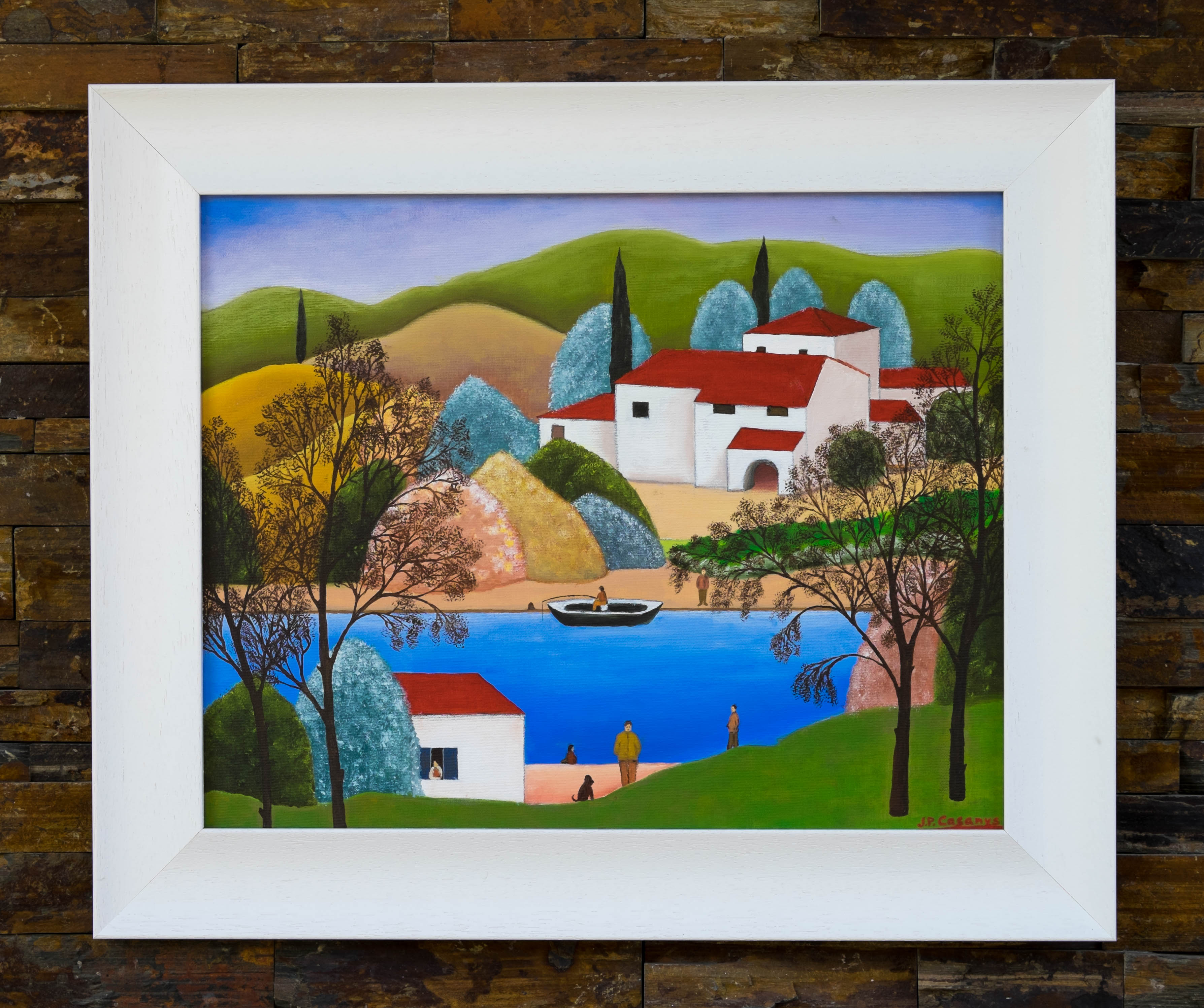 Oleo de casa con flores, montañas, sol, pájaros,....