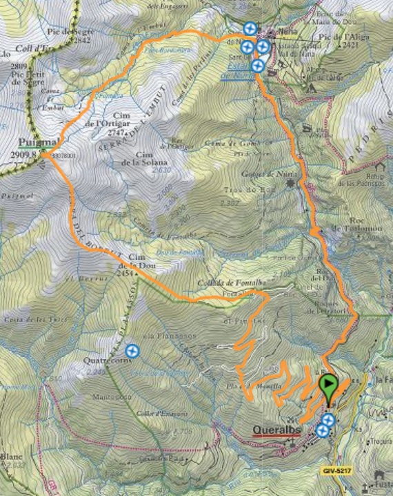 El descenso también tiene su dificultad y su peligro. Lo realizamos por la Coma de l’Embut hasta llegar a Nuria, siguiendo luego por el intrincado sendero que bordea el Río de Nuria y sus impresionantes cascadas, hasta encontrarnos de nuevo en Queralbs. Fin de la ruta.