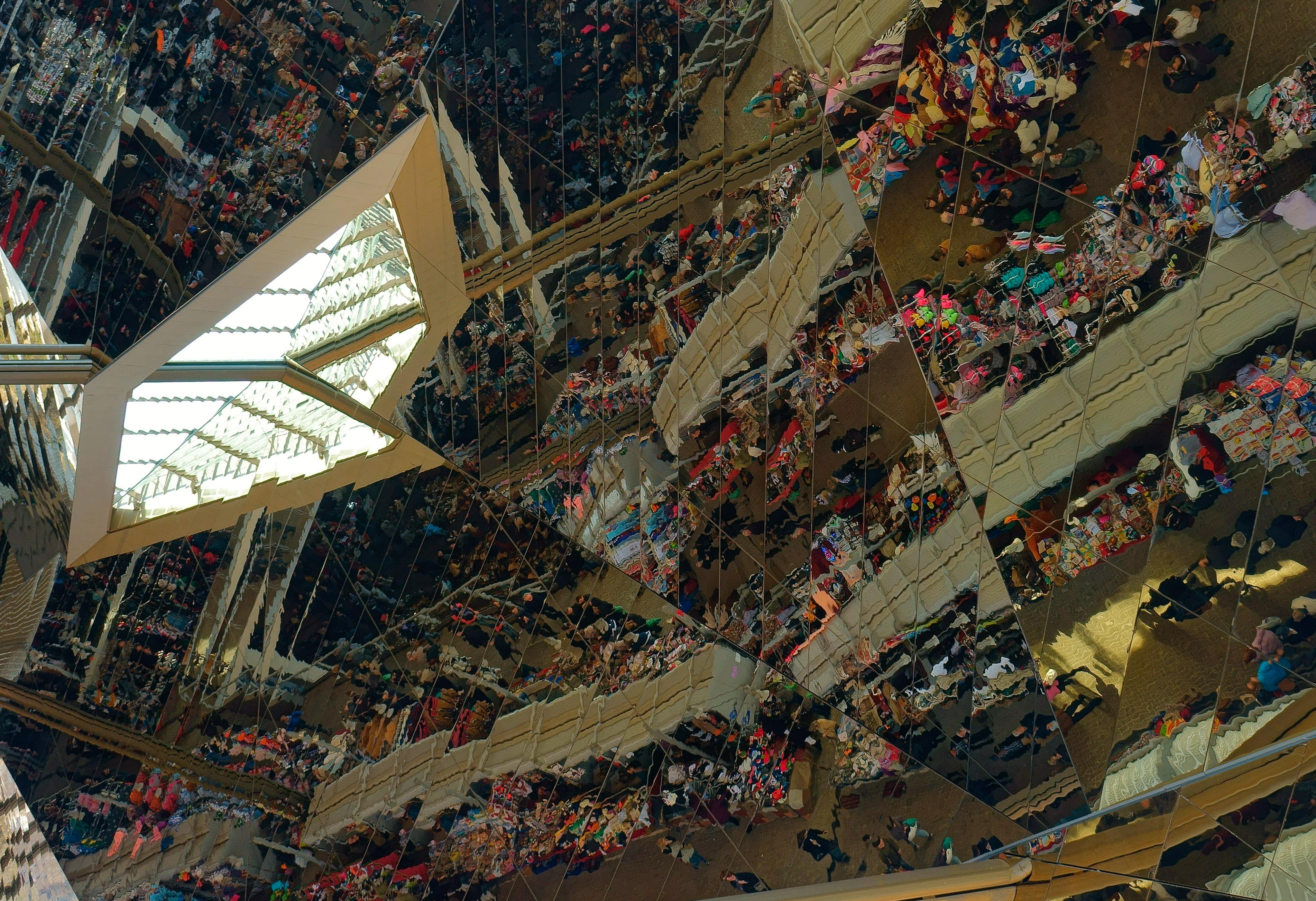 el nuevo edificio tiene un nuevo elemento que atrae a muchas personas: la cubierta con espejos que refleja la vida que se desarrolla en los pasillos y en la plaza de la subasta. Es uno de los puntos más fotografiados del edificio y casi todo el mundo acaba sucumbiendo a la tentación de buscar entre el hormiguero que refleja la cubierta.