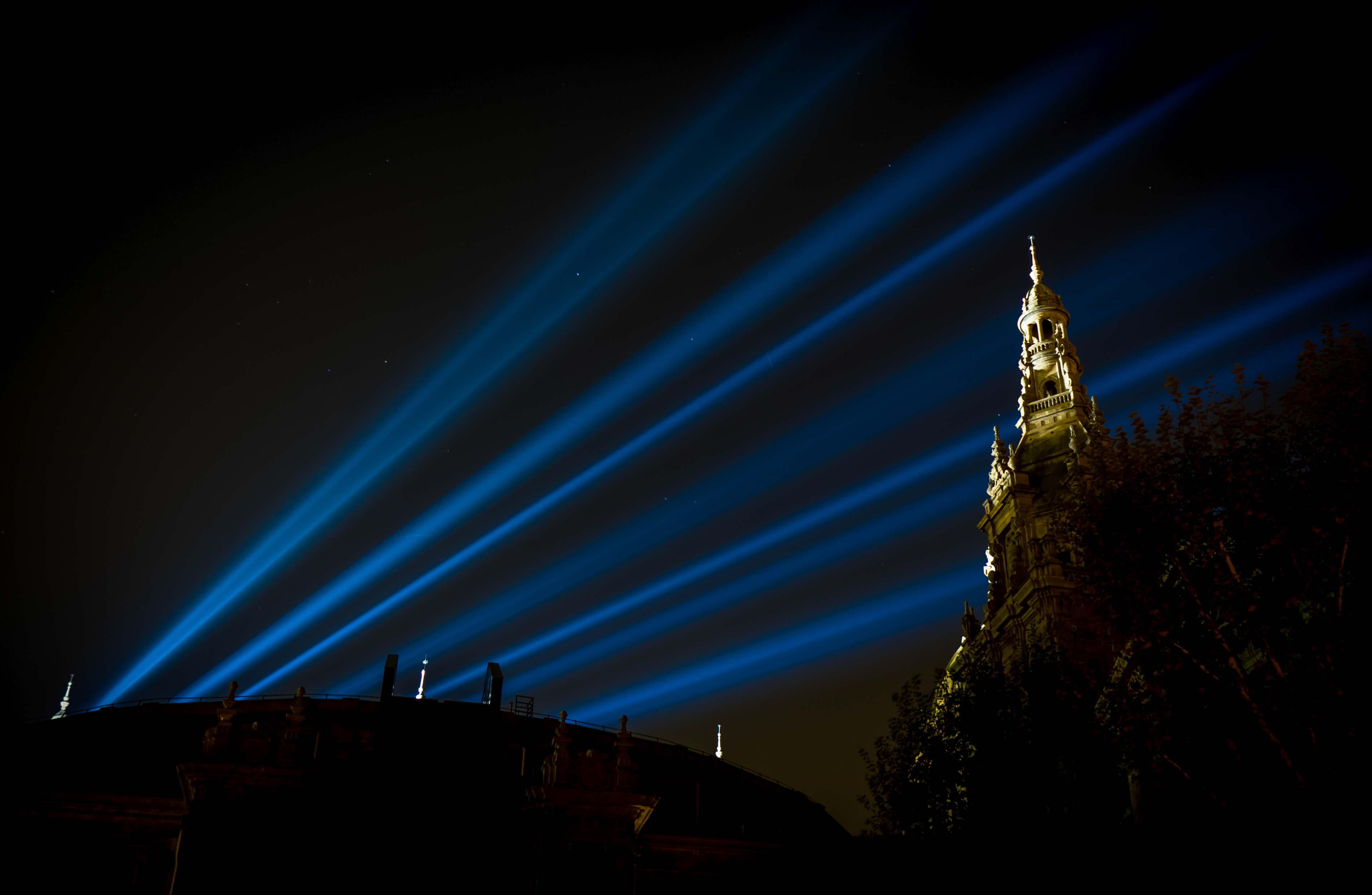 Nueve focos antiaéreos de la última Guerra Civil, iluminan el cielo tras el Palacio. Nine anti-aircraft spotlights the last Civil War, illuminate the sky behind the Palace.
