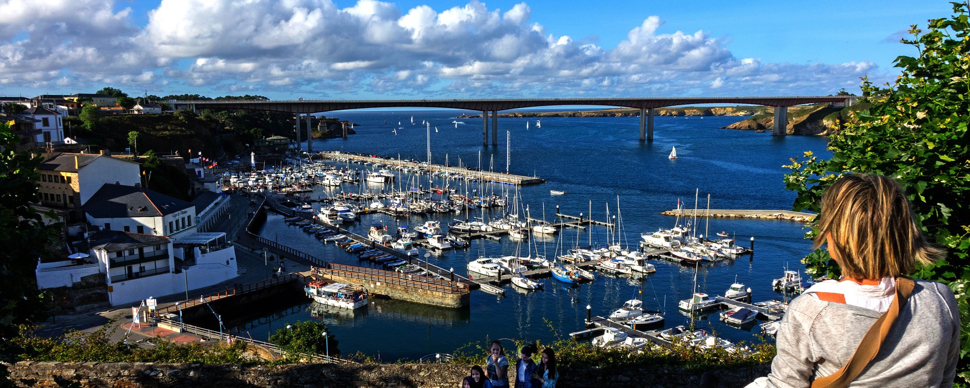 Desde uno de los miradores podemos disfrutar de esta extraordinaria panorámica: el puerto de Ribadeo y el Puente de los Santos, que a través de sus 612 metros de longitud, es el punto de unión entre Asturias y Galicia.