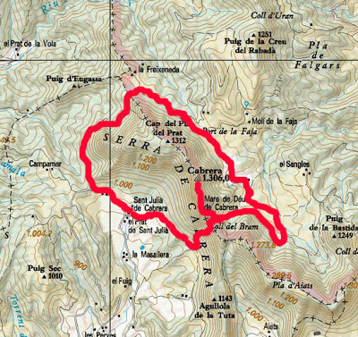 cabraSobre los riscos del Collsacabra se levanta el Santuario de la Virgen de Cabrera a unos 1.300 m. de altura. Un lugar idílico, de los más encantadores de la comarca de Osona, y donde se respira una gran tranquilidad, ya que sólo se puede llegar andando. La caminata, que pasa por el puente de la Rotllada y el Coll del Bram, no es muy larga y, realmente, vale la pena.