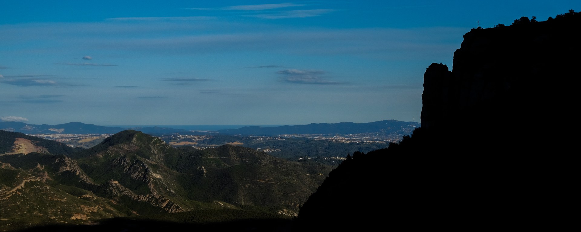 Es una suerte ver caer la tarde desde el Monasterio de Montserrat, sobretodo en un día claro y diáfano como fue el pasado domingo. Tras la silueta de las Montañas de Montserrat podemos ver la Sierra de Coll Cardús, la comarca del Valles Occidental y al fondo, la montaña del Tibidabo, ocultando la ciudad de Barcelona. En la lejanía también se divisa el horizonte del Mar Mediterráneo.