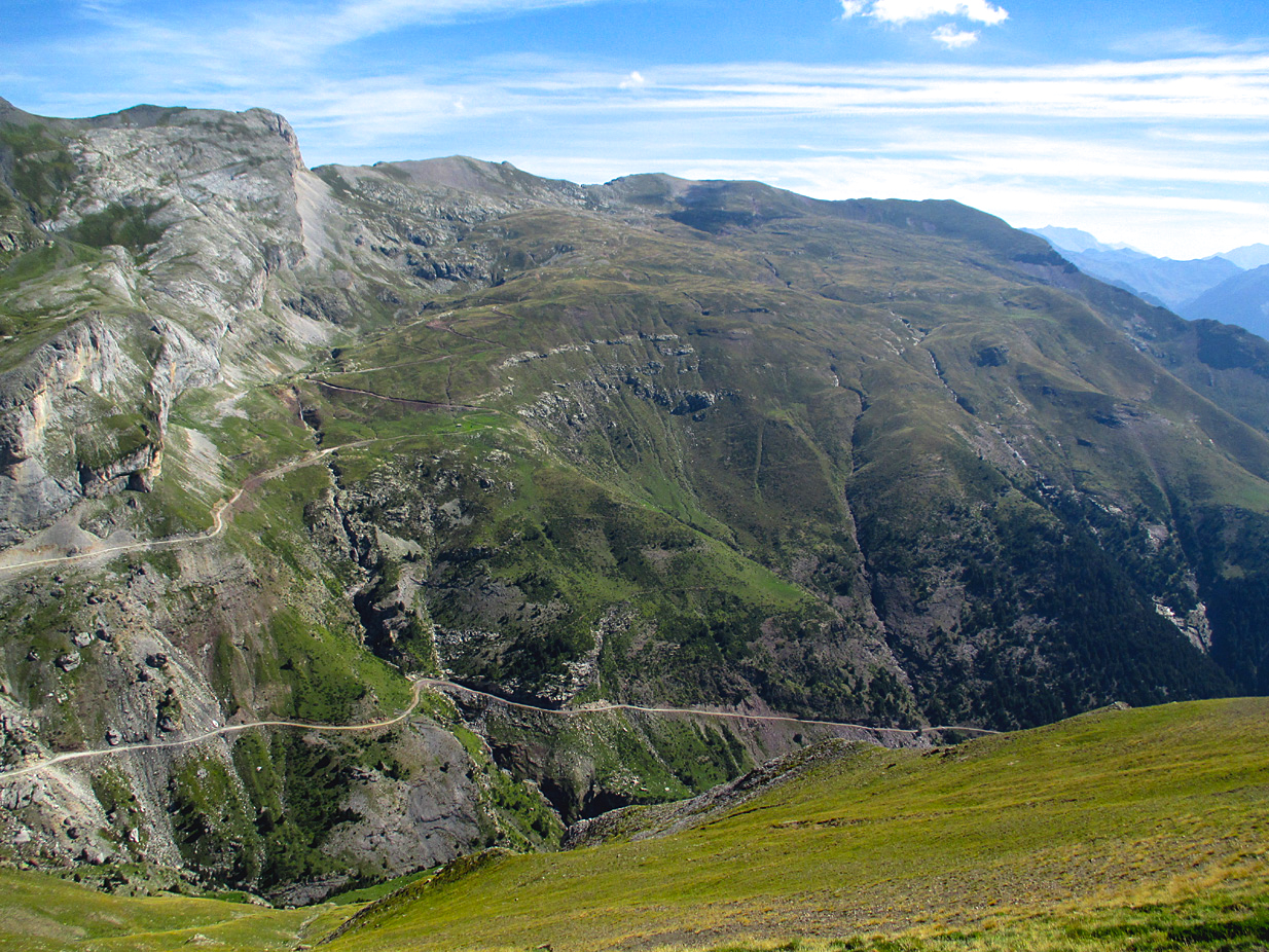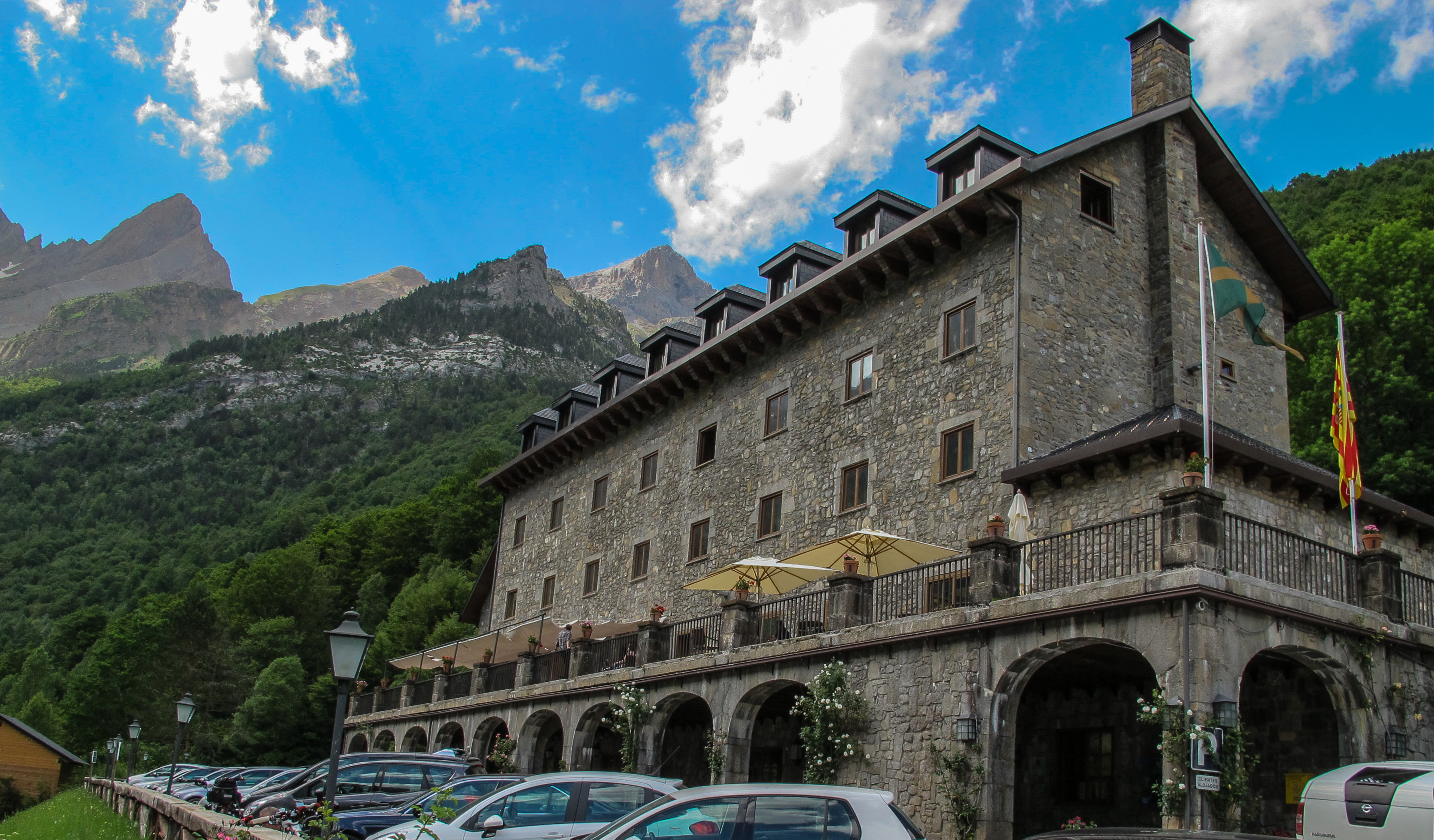 A partir de aquí la pista se trasforma en asfalto y seguimos descendiendo por una carreterita con gran desnivel hasta llegar a la carretera de Bielsa al Parador (km 26,76) donde giraremos a la dcha. y seguiremos hasta el Parador (km 34,37).