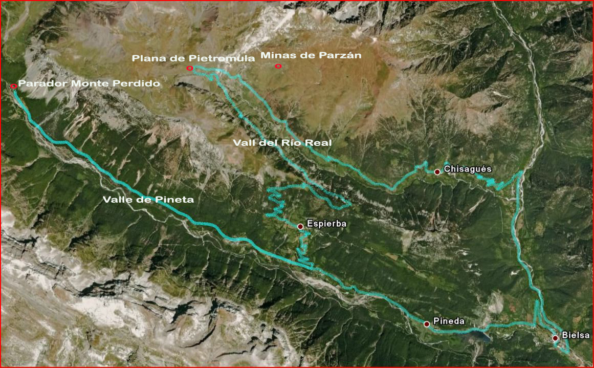 Impresionante ruta circular de alta montaña por el Pirineo Oscense que, partiendo de Bielsa, atraviesa los valles del Río Real y de Pineta.