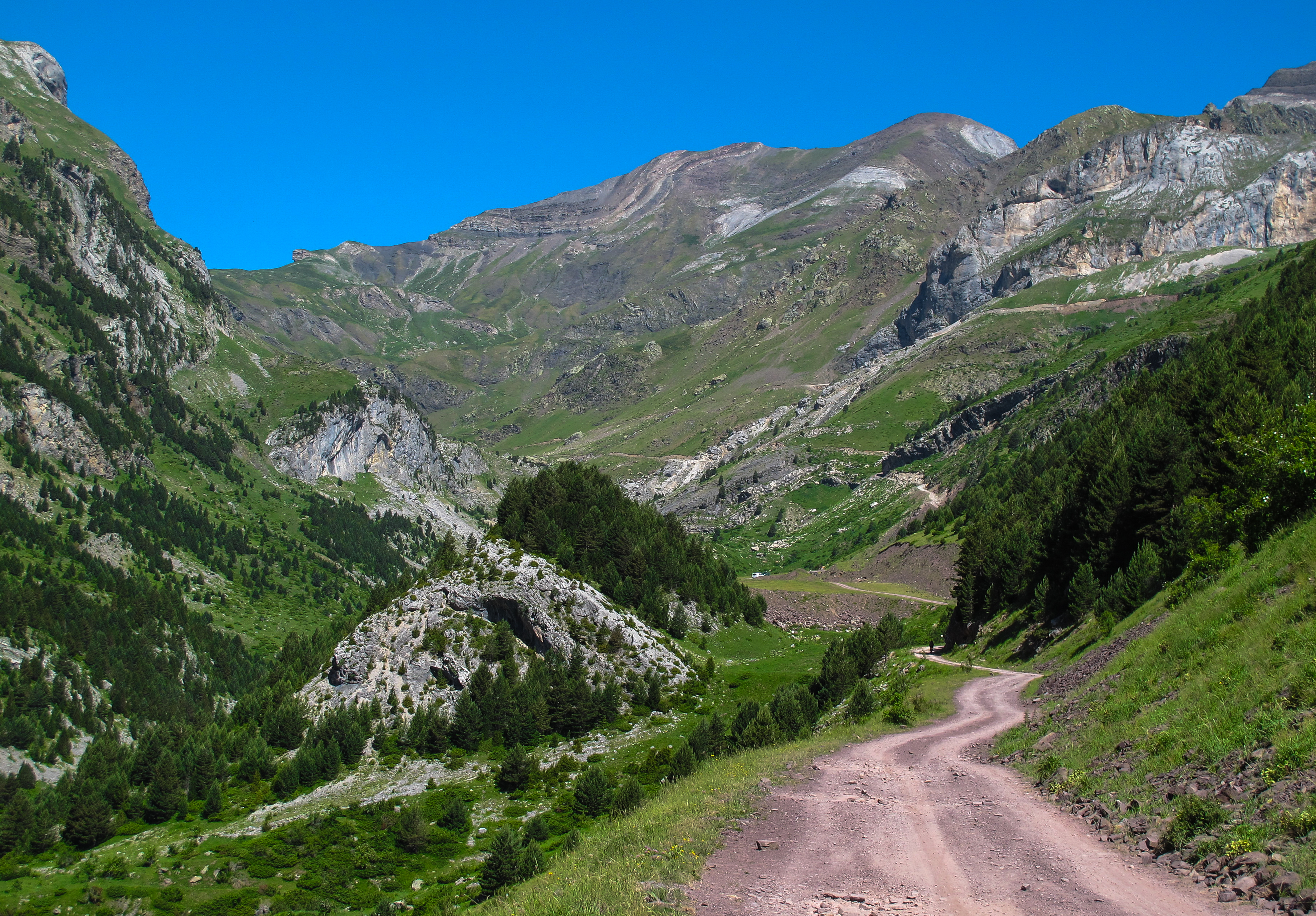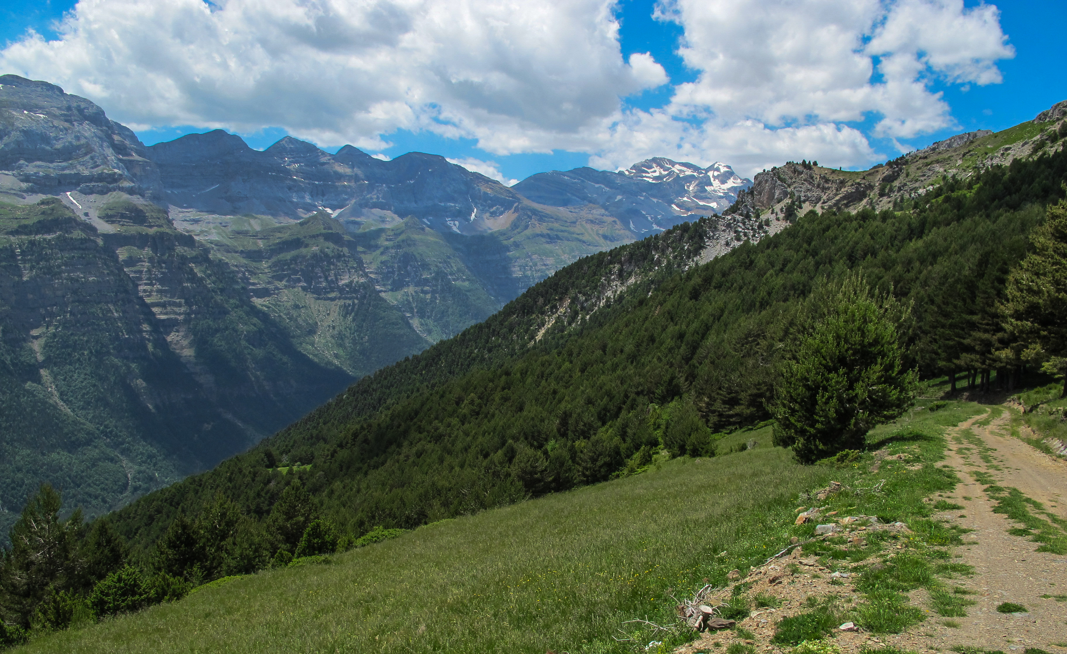 A partir de aquí el asfalto se trasforma en pista de bastante buena calidad (esto es muy variable de un año a otro) que de forma cómoda y relativamente suave nos lleva por la margen derecha del valle, entre árboles al principio para abrirse después algo más transformándose en prados. A nuestra izquierda, al otro lado del valle, veremos en todo momento la senda por la que cruzaremos al valle de Pineta.