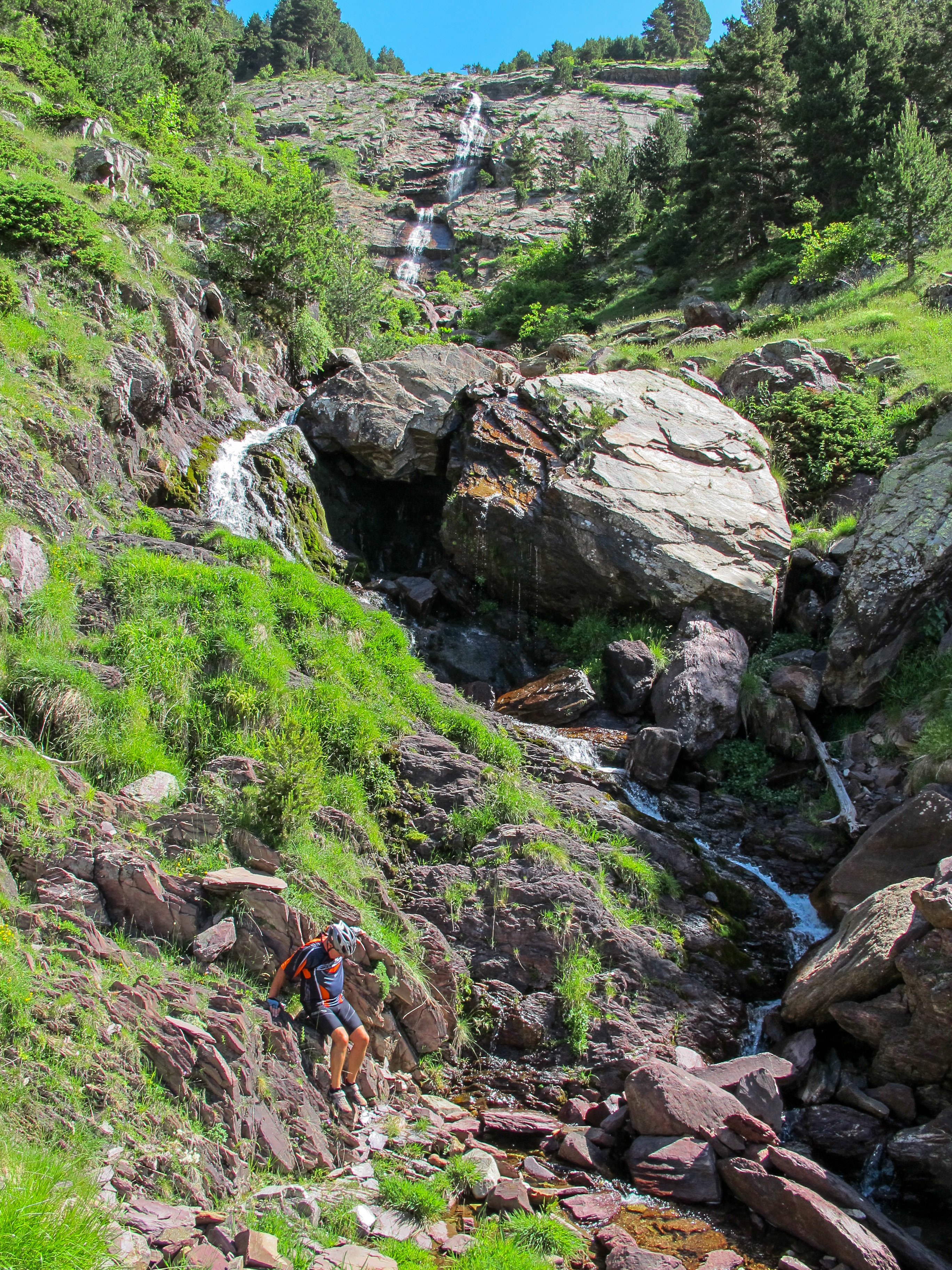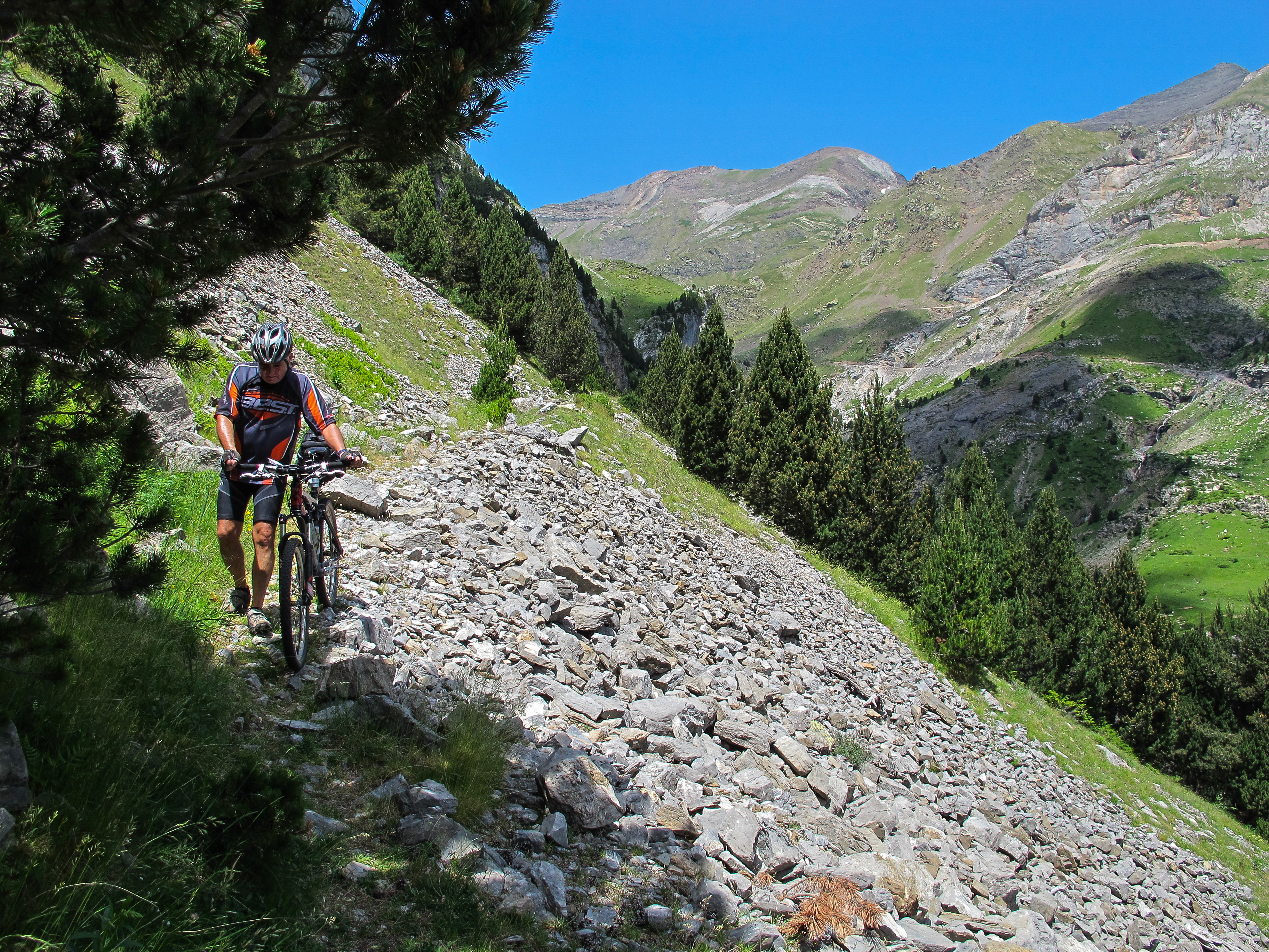 En el km. 11,86 la pista empeora y se empina bastante con rampas con tramos entre el 10 y el 20 % que unido a lo suelto del terreno pueden hacer recomendable echar el pié a tierra. De esta manera y tras pasar varios barrancos que pueden tener bastante caudal, llegamos en el km14,25 a una curva a derecha muy pronunciada (si tenemos tiempo y ganas podemos seguir la pista en ascenso duro para llegar hasta las minas de plata y plomo de Parzán) donde giraremos a la izquierda por la senda para cruzar el barranco por un puentecito y tomar al otro lado un resto de camino ciclable en poquísimos tramos al principio para hacerse necesariamente a pié el resto debido a la gran cantidad de lajas que se desprenden sobre el sendero y donde pondremos a prueba la calidad de nuestro calzado. Esta senda que primero desciende algo, luego sube hasta el collado de Espierba (km 19,29) a partir del cual se trasforma en pista ciclable. En este collado hay preciosas vistas hacia los dos valles y hacia el valle de Ordiceto y límites del valle de Gistain.