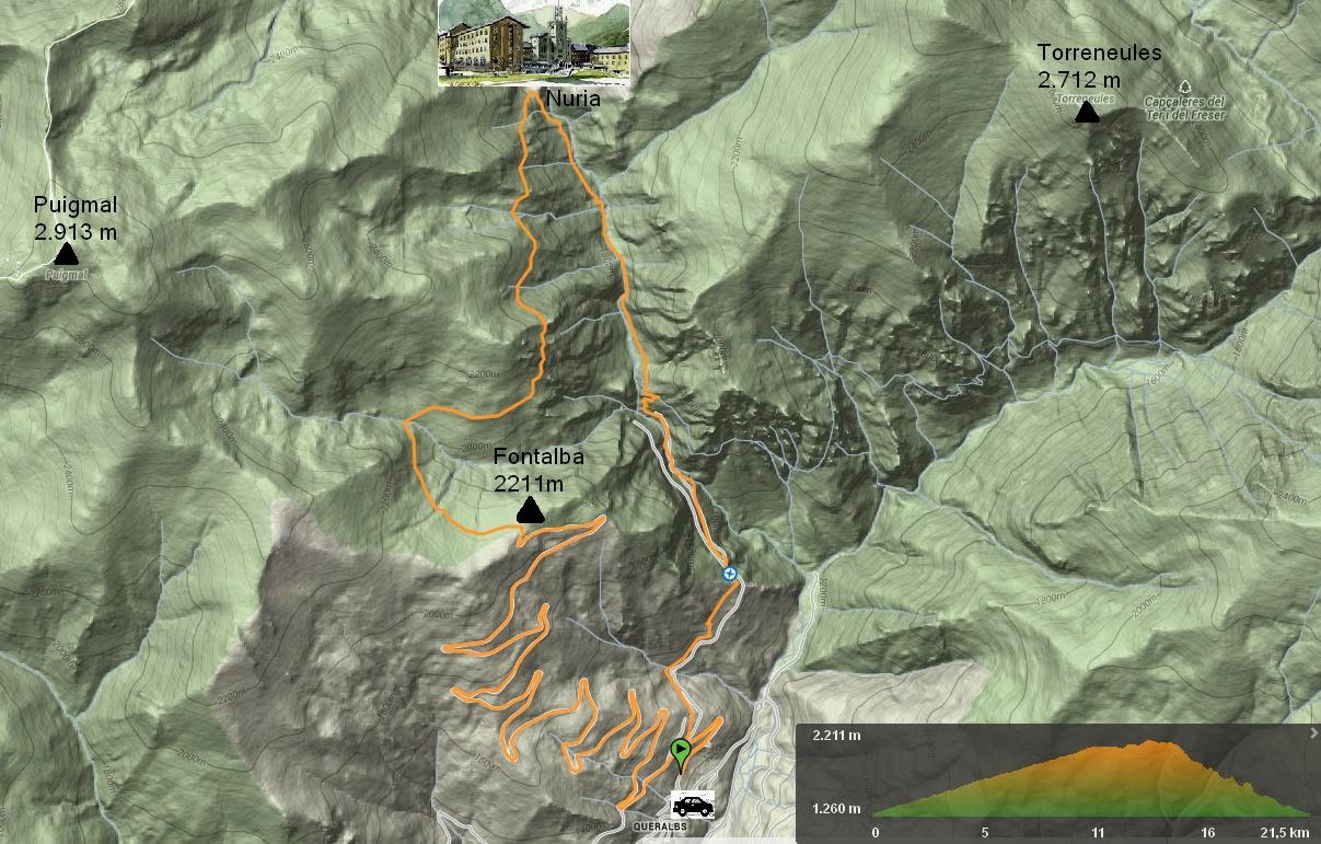 La primera parte del recorrido entre Queralbs (1.236 m.) y Fontalba (2.070 m.) se realiza por una pista en buen estado, de unos 12 km. que va subiendo en zig-zag hasta la Collada. Se hace fácil mientras vas deleitándote de la inmensa panorámica.