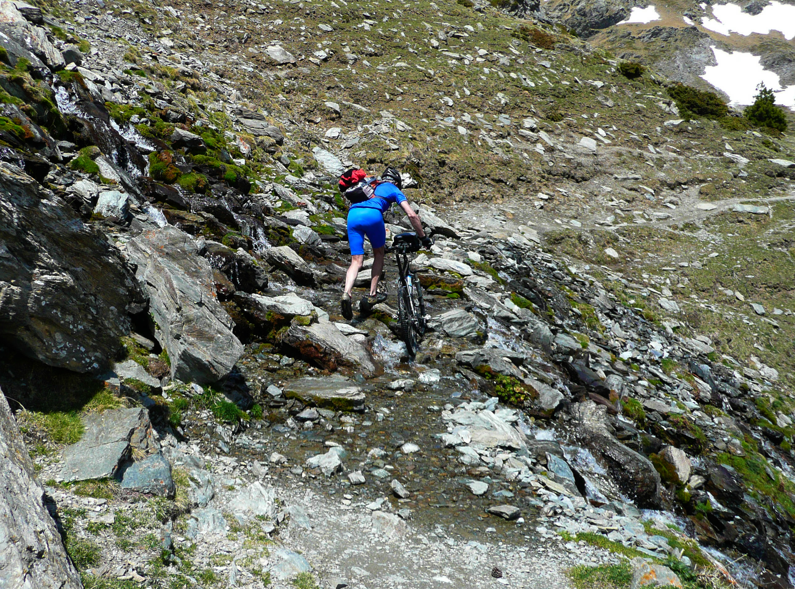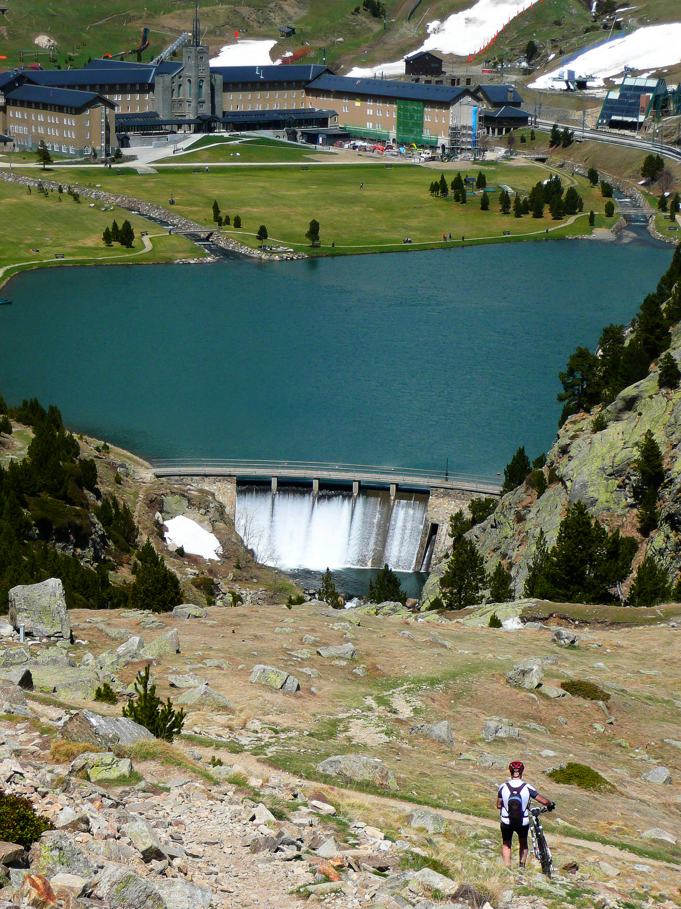 Una vez en la collada, cogeremos el GR11.8 que sigue a mano derecha, después de un prado. Este tramo hasta Nuria ya es distinto del anterior. Es más corto (5,5 km.), un sube y baja constante de la bicicleta, bordeando grandes precipicios, atravesando torrentes y grandes placas de nieve. El final del tramo es un descenso muy pedregoso y empinado, pero el panorama del Vall de Nuria nos compensará con su grandiosidad.