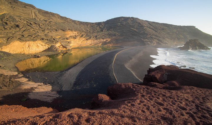Few sunsets have more charm in Lanzarote than watching the sunset in the Gulf, either on one of its terraces enjoying the views, or next to the Charco de los Ciclos (or Laguna Verde) appreciating all the magic of the shades. Its black sand, the green lake and the reddish hue of the volcano that embraces it.