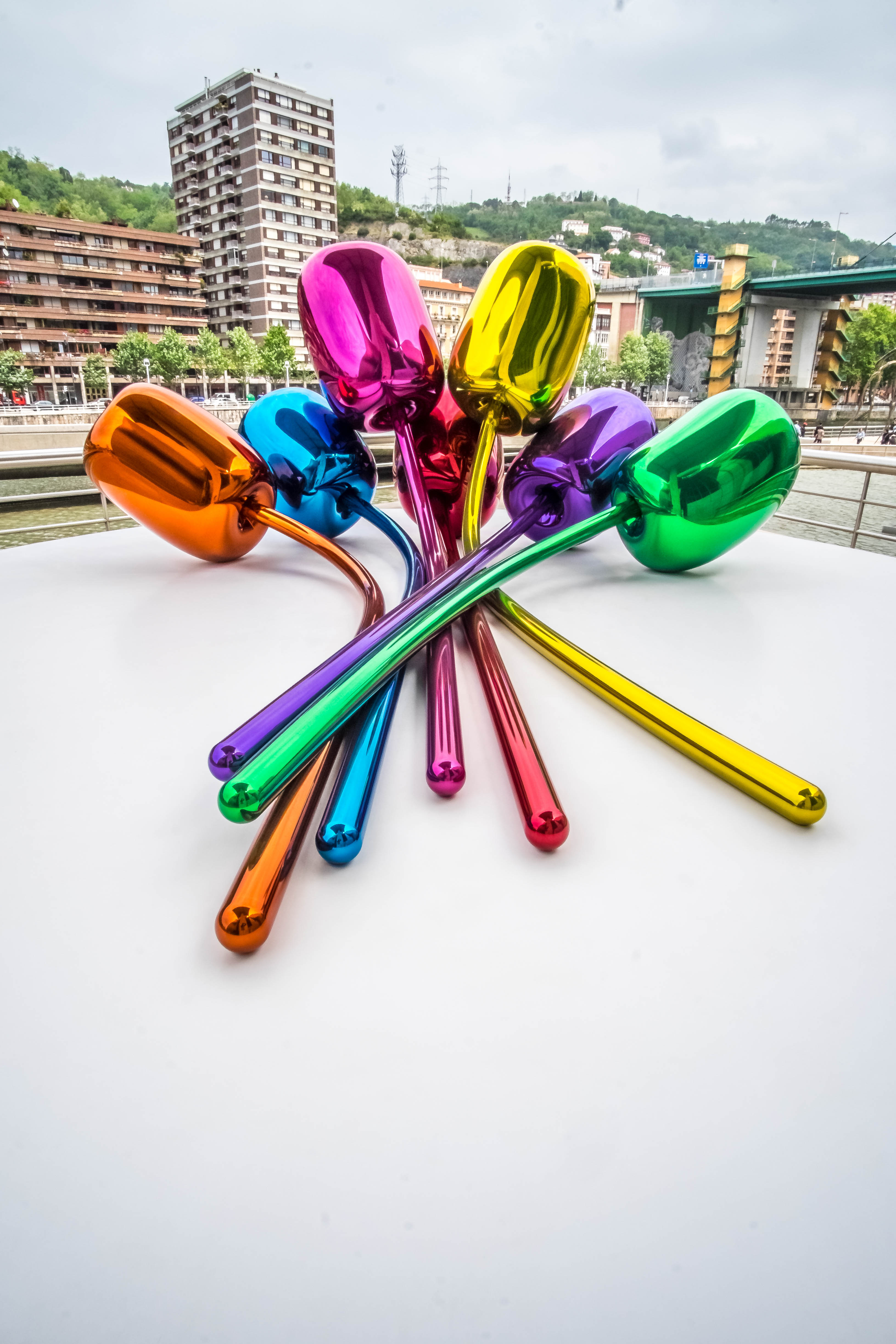 «Los Tulipanes» un ramo de flores de globo multicolor situado en el exterior del museo con vistas al horizonte, obra del artista Jeff Kroons.