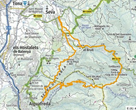 Para poder probar y tomar contacto con mi nueva bici, he querido hacer una travesía clásica en el entorno del Montseny, con un recorrido de unos 35 kms. de distancia y cerca de los 1.000 m. de desnivel positivo, siempre por pistas y caminos de montaña. Salida de Seva dirección Aiguafreda por el GR-2, pasando por el Brull y bordeando la Serra de l’Arca hasta Can Serra de l’Arca, a partir de aquí descendemos hacia la Riera d’Avencó, pasando antes por Sant Miquel de Canyelles. Desde este punto vamos bordeando la riera y antes de llegar al Pantá del Tercer Pont, tomamos en largo ascenso, la pista que nos llevará al Clot y a Sant Cebrià de la Mora, para unirse más arriba a la pista del Plà de la Calma. Una vez aquí, seguiremos hasta Collformic y luego descenderemos hasta Seva, por el sendero que pasa por la Font del Faig o por carretera.