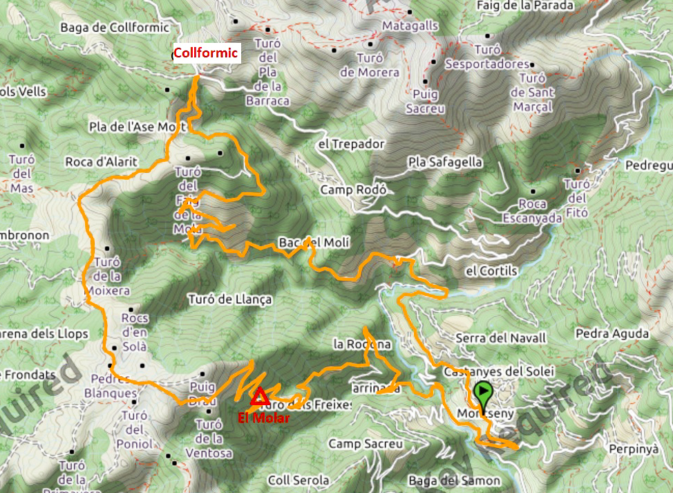 Partiendo de Seva, a unos 10 kms. más arriba se llega a Collformic, desde donde tomamos una pista en descenso que pasa por El Vilar de la Castanya y más abajo hasta el pueblo del Montseny, en unos 13 km. A partir de aquí, sale la pista que en unos 10 km. de fuerte subida nos lleva hasta el Molar y más tarde hasta el Pla de la Calma y de nuevo hasta Collformic, después de 12 km. más.