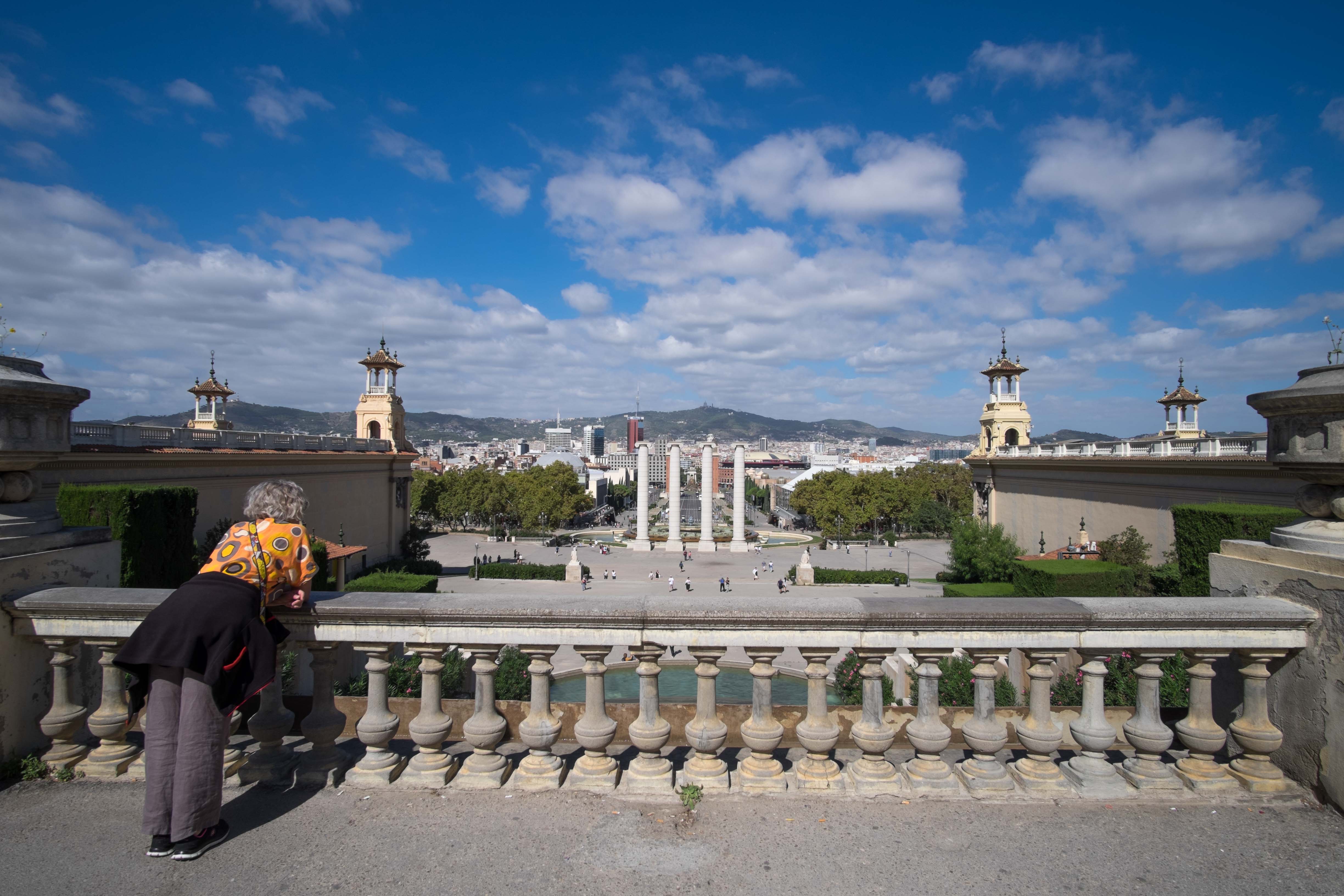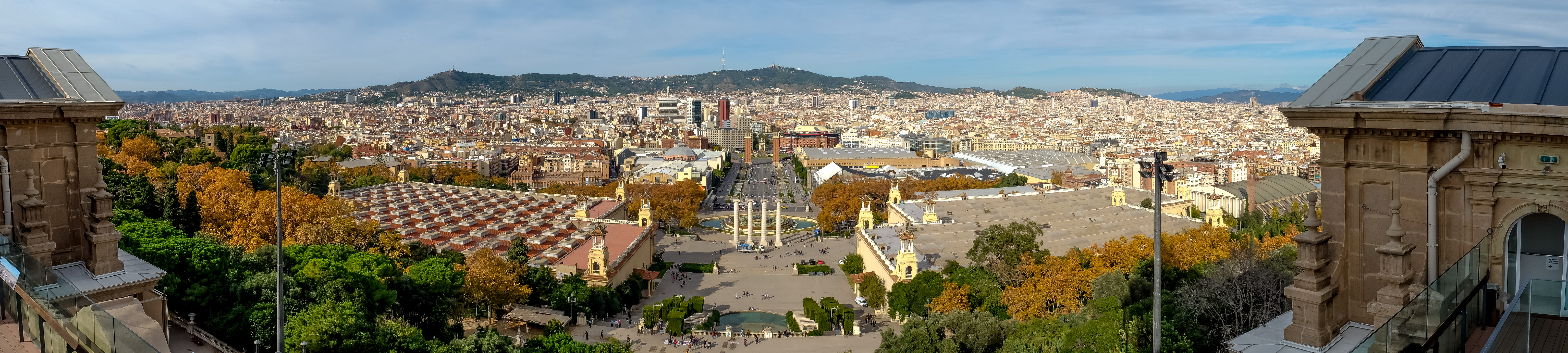 Pero en esta última visita al museo, lo que más me sorprendió fue descubrir que existe un acceso a la terraza superior del Palacio, con una espectacular visión de 360º sobre el contorno del palacio. No es fácil de encontrar el acceso. Preguntad por «El Mirador del MNAC».