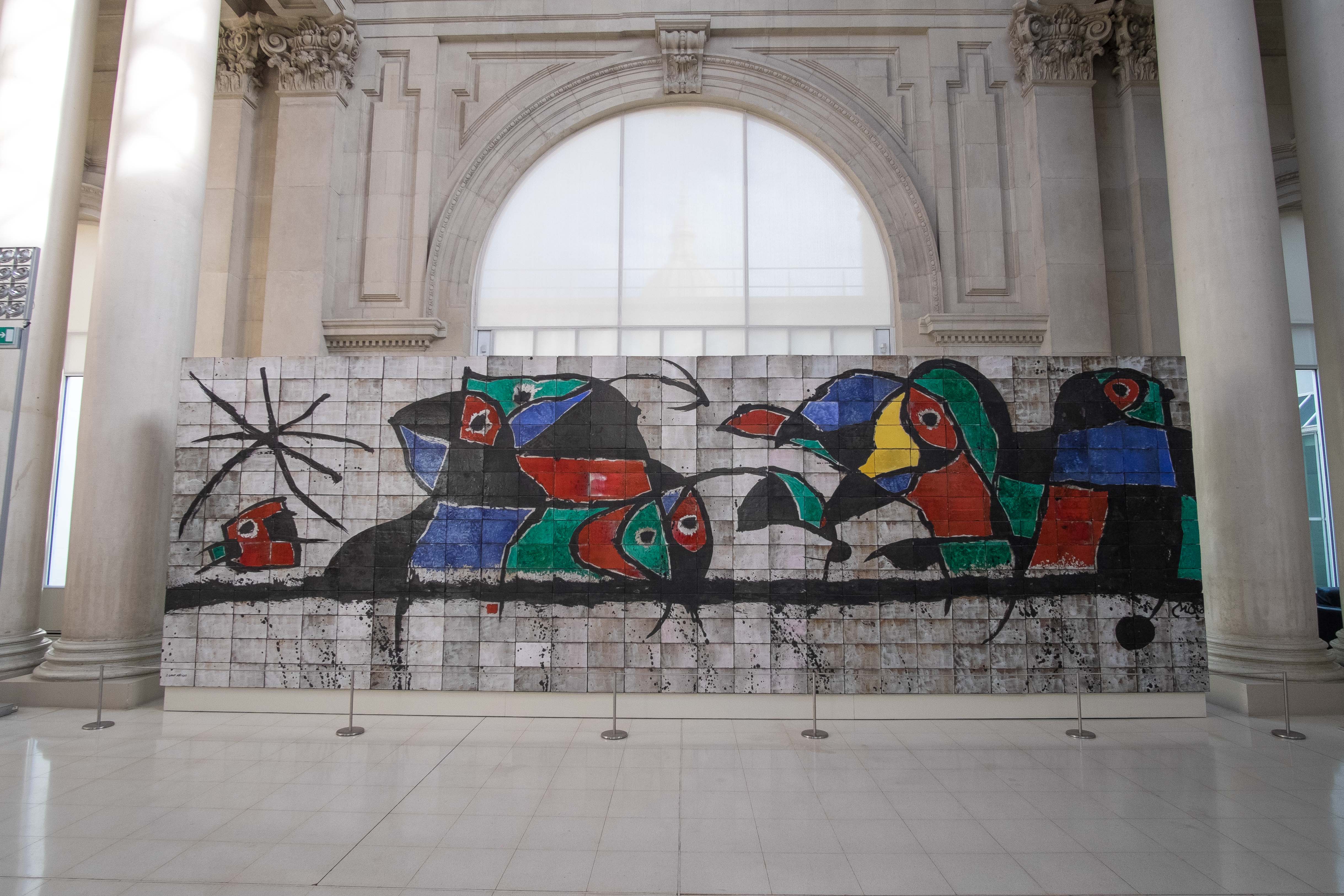En este mismo vestíbulo esta expuesto el mural que realizaron Joan Miró y el ceramista Joan Gardy hace 35 años, por encargo de la entonces puntera IBM, probablemente ha llegado a su morada definitiva: la Sala de la Cúpula del MNAC.