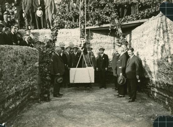 El 30 de junio de 1926 se colocó la primera piedra. Entre los asistentes, el presidente del comité ejecutivo de la exposición, el marqués de Foronda; el alcalde de Barcelona, el barón de Viver, y el director de Construcciones del certamen, y uno de los padres del proyecto, Pere Domènech i Roure. Foto: Arxiu Històric de la Ciutat
