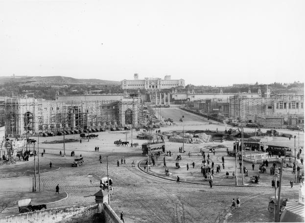 Estado de las obras de la Exposición Internacional de Barcelona hacia marzo de 1928. El Palau Nacional visto desde la plaza de España. Foto: Arxiu Institut Municipal d’Història