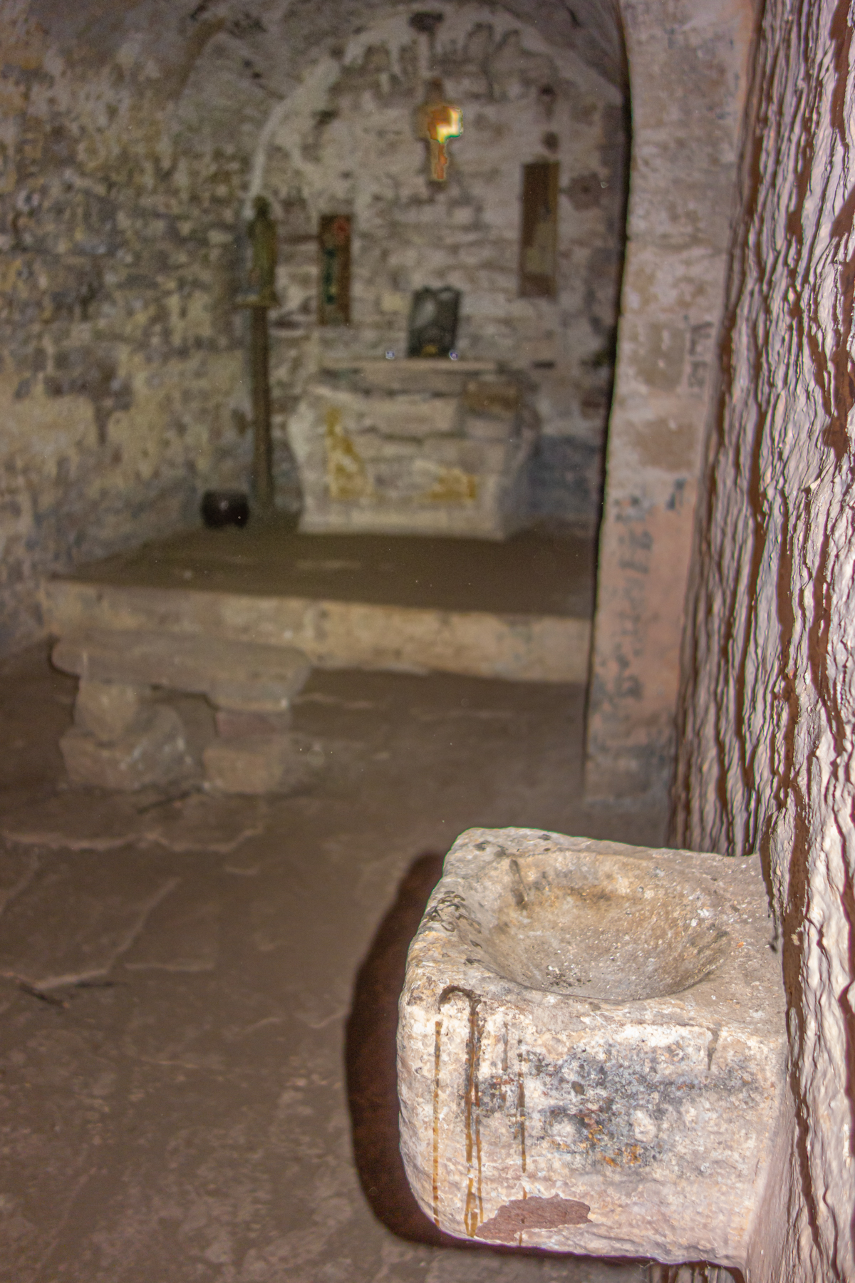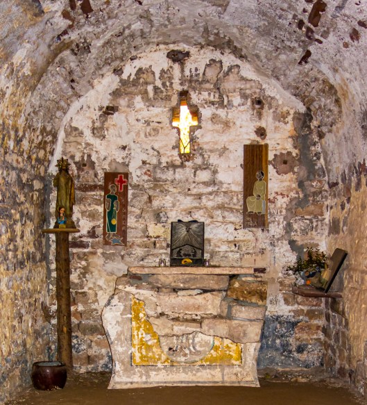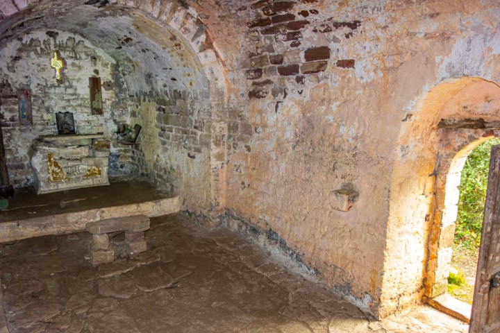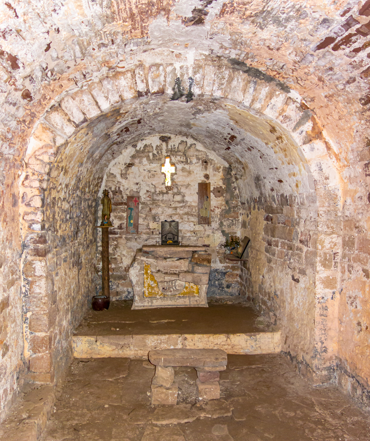 Al presbiterio hay los restos de un altar de obra con restos de pintura. Como únicas aperturas del edificio encontramos el portal del muro de mediodía, de arco de medio punto con pequeñas dovelas; una ventana al ábside en forma de cruz y una de cuadrada a poniente.