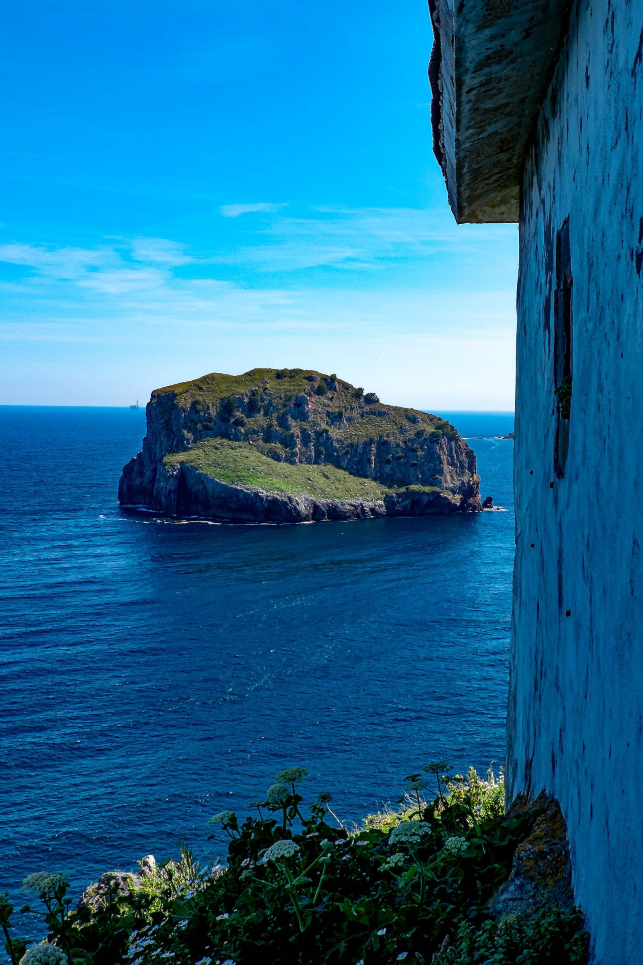 Imagen tomada desde la parte trasera de la ermita. Se puede observar de nuevo la isla de Aquetch y mucho más la fondo, en el horizonte, la pequeña silueta de la plataforma de gas «Gaviota», situada a unos 8 kms. de la costa.