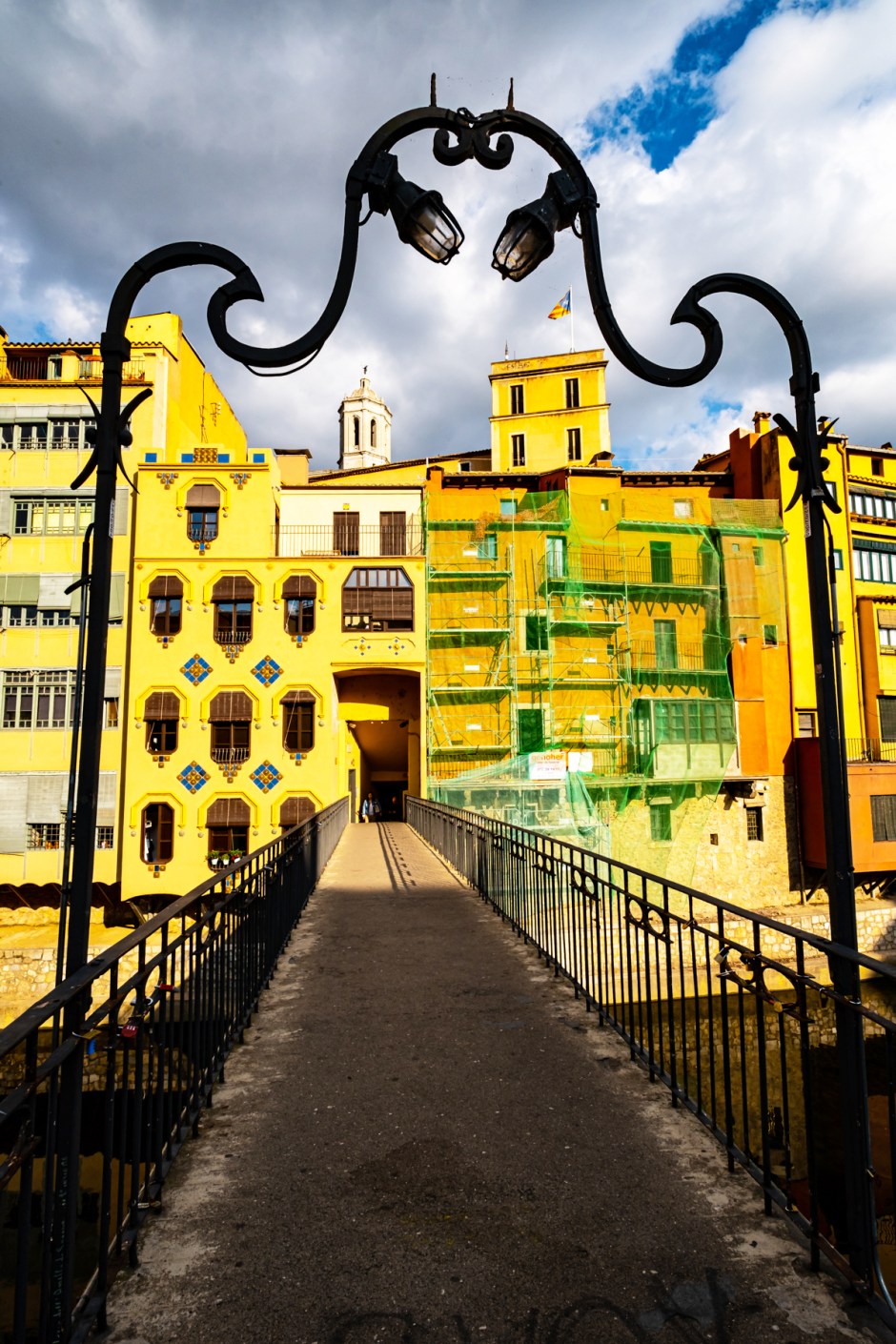 La estrecha y encantadora calle Calderers ya nos ofrece una primera impresión de la arquitectura y estética del casco antiguo de Girona. Al final de esta calle, al lado de una farmacia y medio escondido por las fachadas de las casas del Onyar, encontraremos el acceso al Pont d’en Gómez.