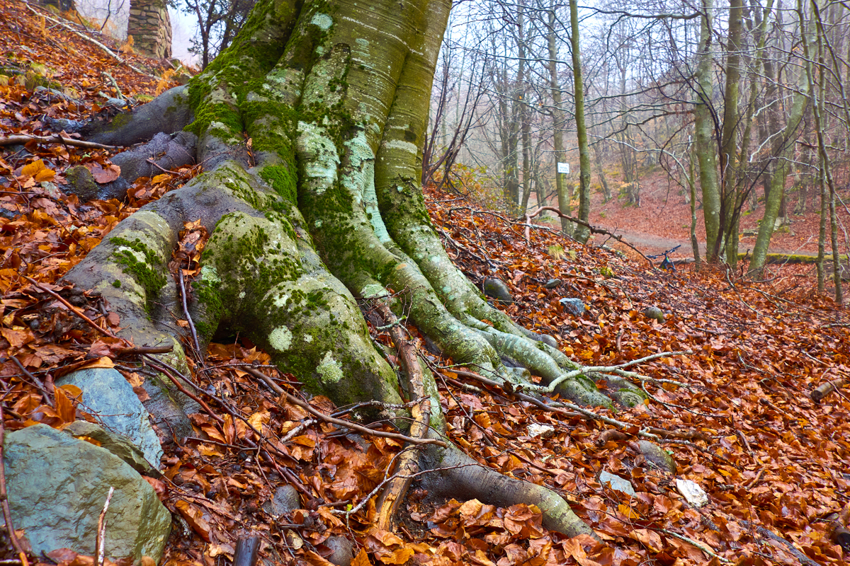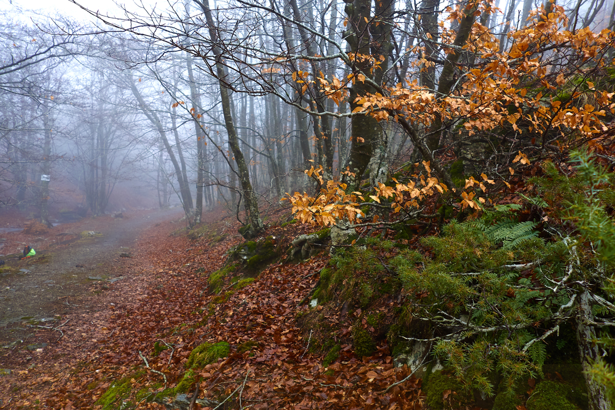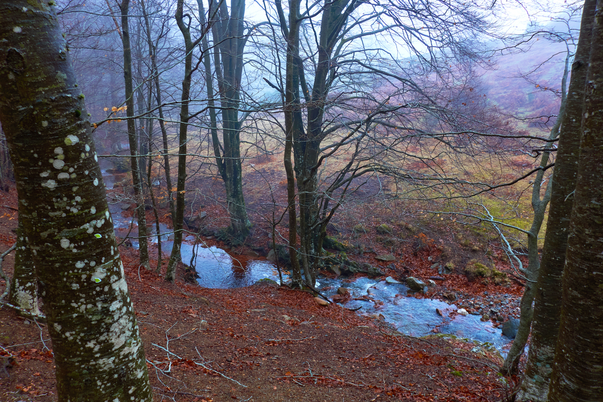 Después de más de dos semanas de anticiclón y sequía, las primeras lluvias han llegado con la primavera y han teñido de intensos colores lo que antes eran paisajes monocromáticos e insípidos. Los arroyos vuelven a tener vida y se escuchan ya desde la lejanía, las hojas caídas del pasado otoño reviven intensas, incluso las que permanecen aun sujetas a las ramas. El musgo parece mas verde que nunca y hasta los pájaros empiezan a dejarse oír tímidamente. También la niebla quiso hacer presencia para dar un manto de misterio a los hayedos.