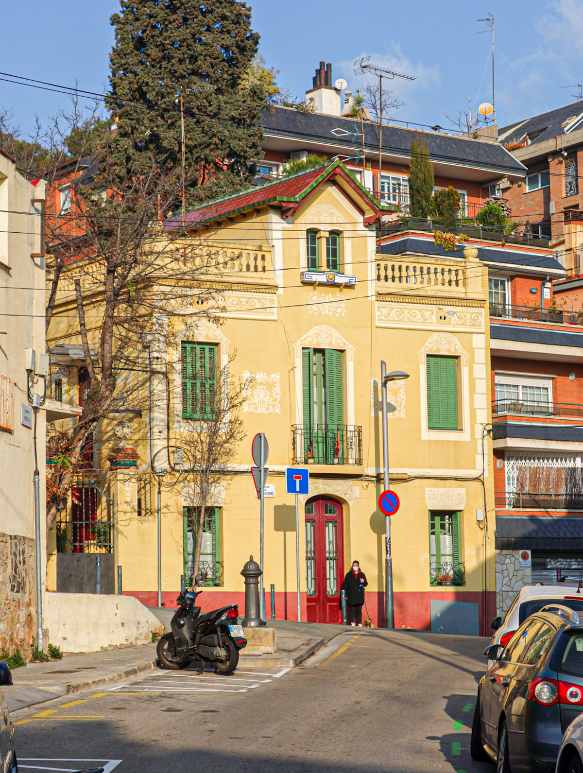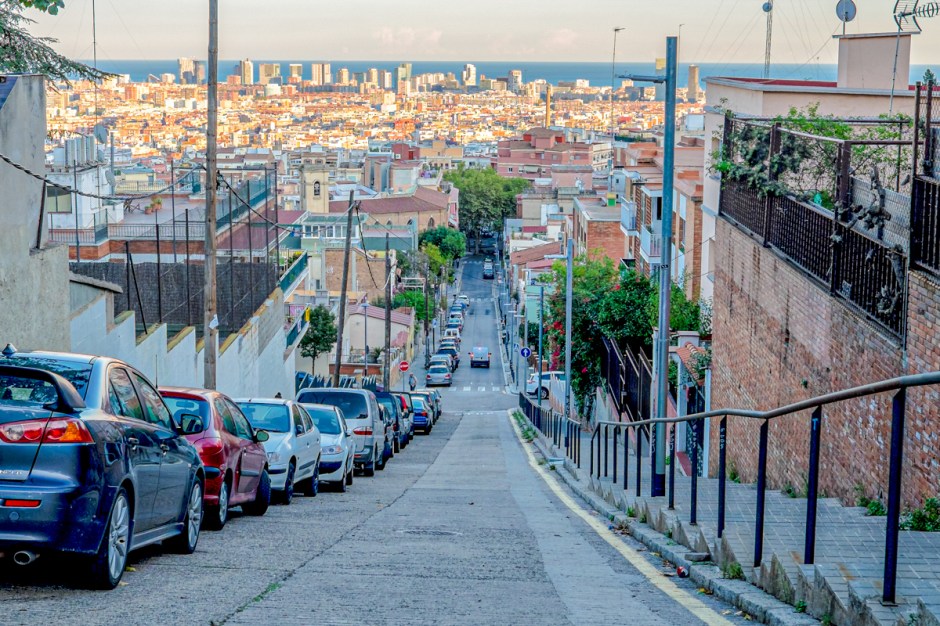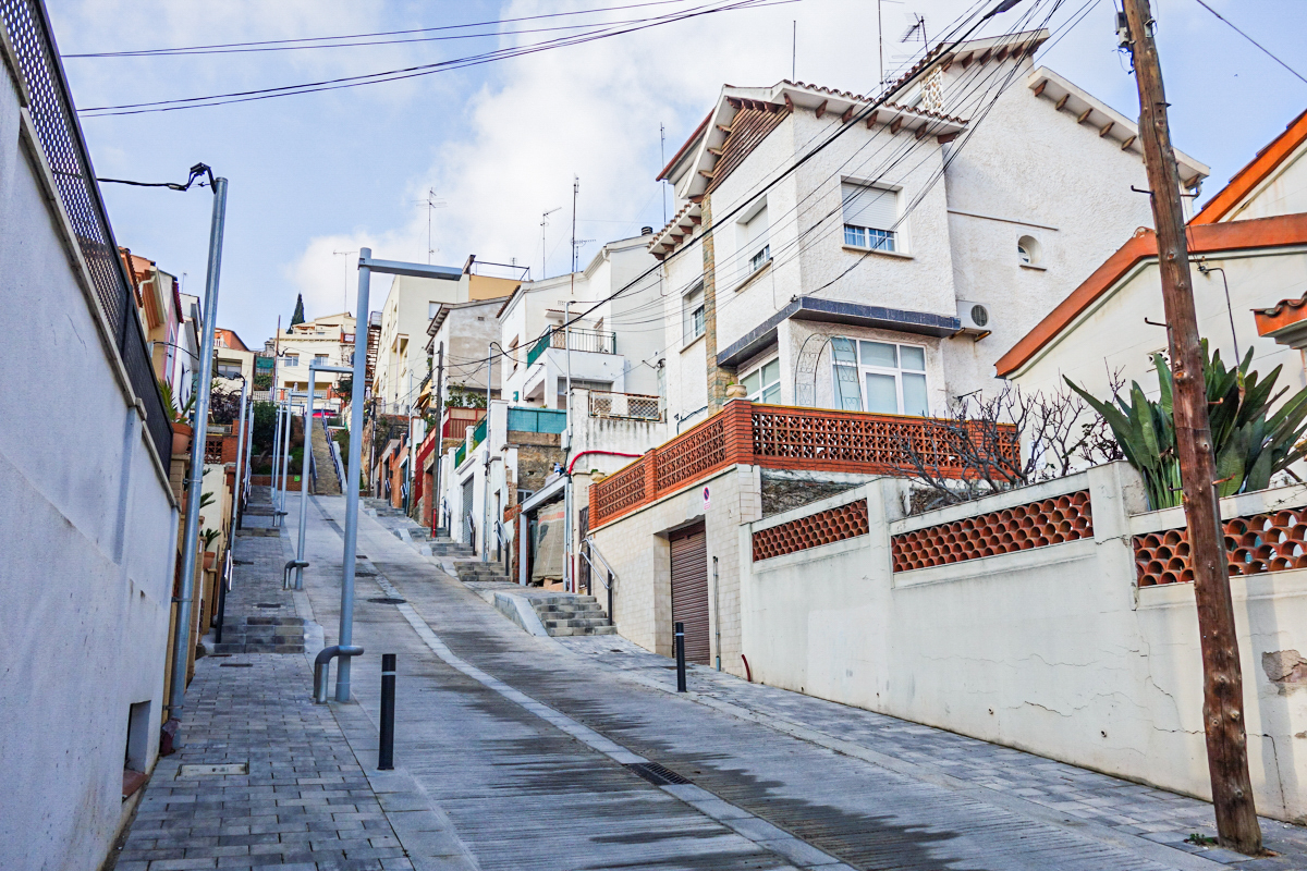 La calle Llobet y Vall-llosera es un claro ejemplo de las vertiginosas pendientes que alcanzan sus calles, desde el mar a la montaña. En muchas ocasiones salvadas por escaleras de obra o «mecanizadas» Al fondo de la calle vemos la Plaza Catalana, otro lugar simbólico del barrio.