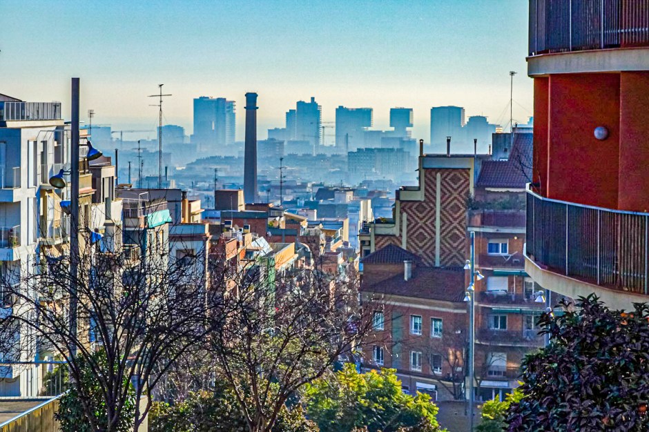Esta fotografía está tomada desde El Mas Guinardó con un teleobjetivo. Al fondo, antes del mar, podemos observar las siluetas de los edificios de Diagonal Mar.