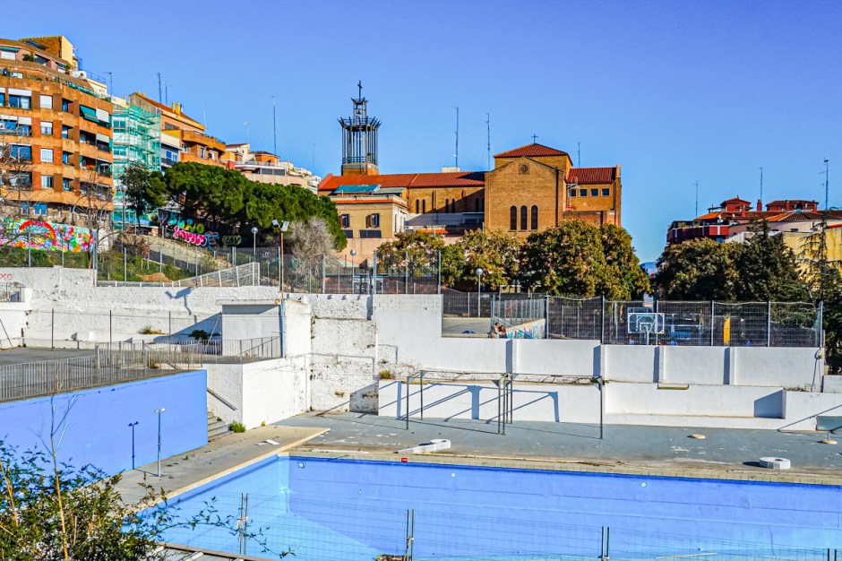 Arriba, la Parroquia de la Mare de Deu de Montserrat, ubicada en la avenida del mismo nombre. Y en primer plano, las piscinas del CEM Guinardò
