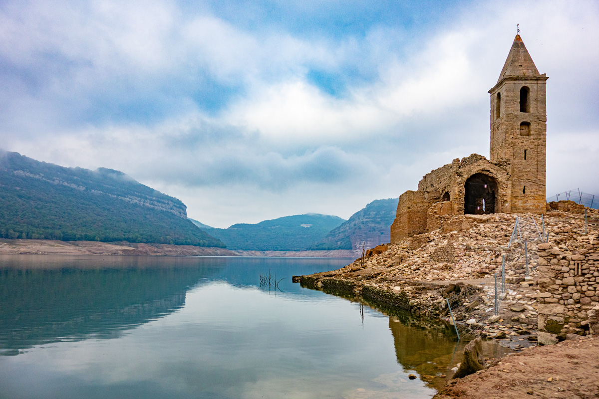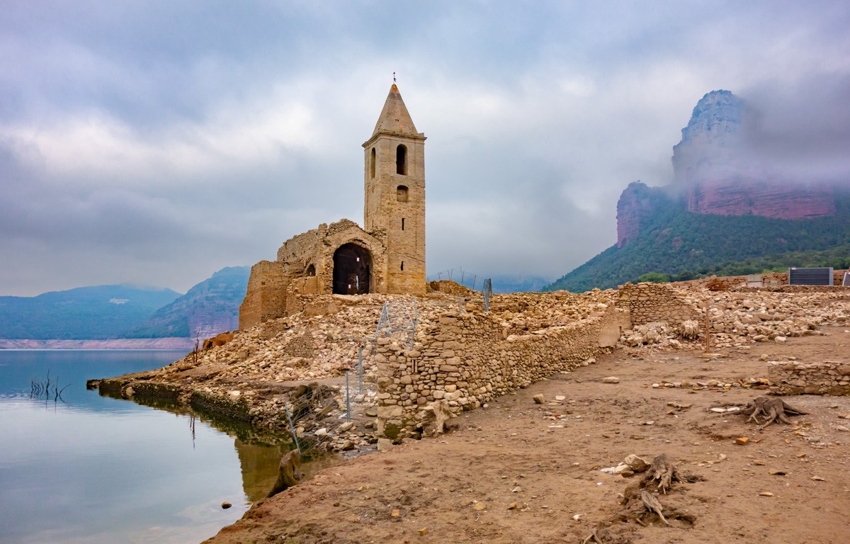 La iglesia de Sant Romà culmina las ruinas que aun quedan, después de 57 años de haber sido sepultado bajo las aguas al construir el actual embalse.