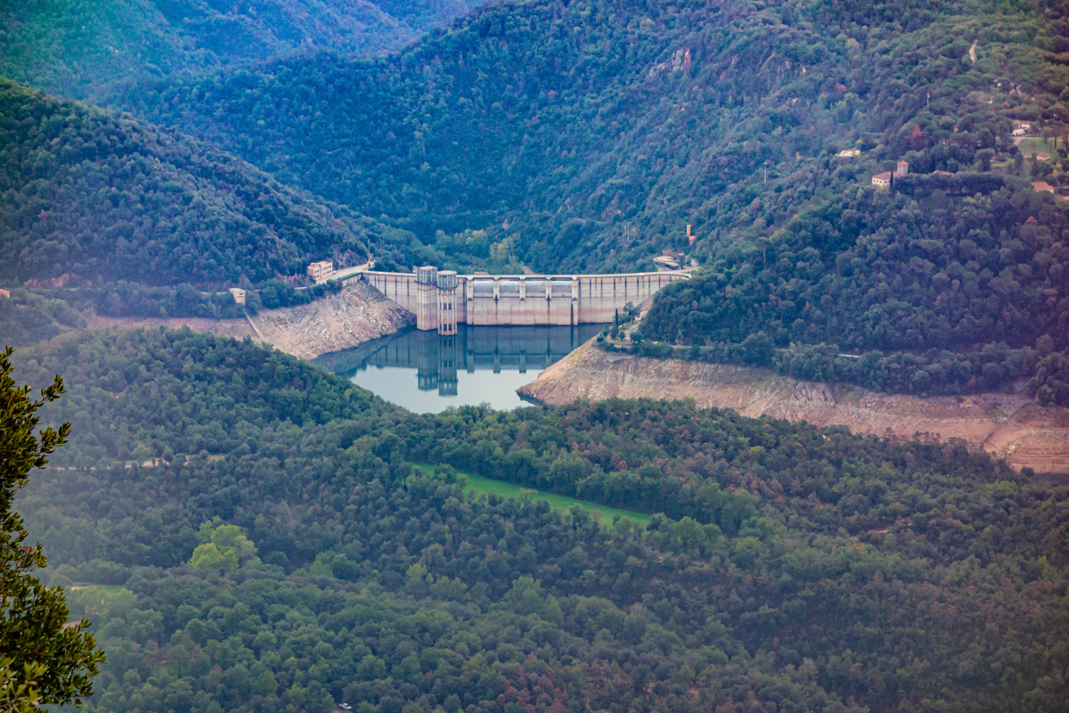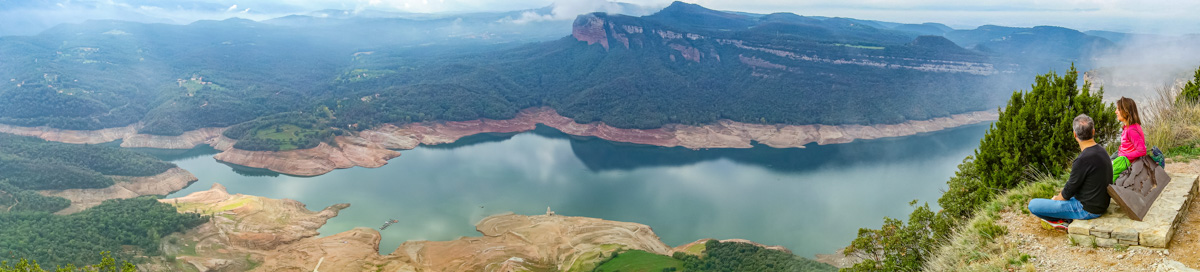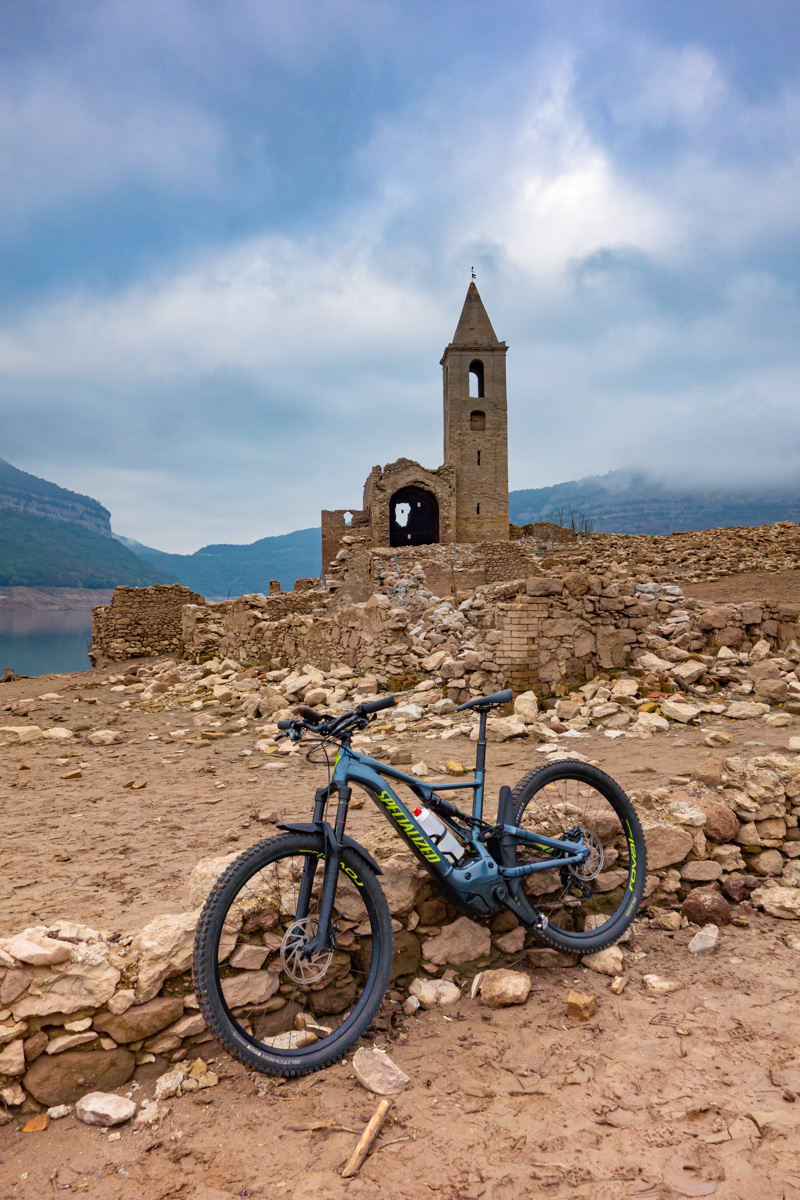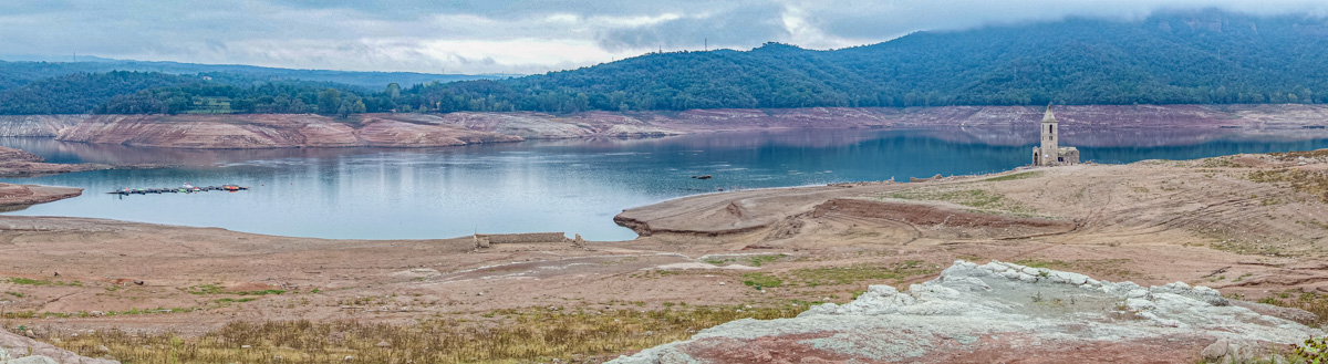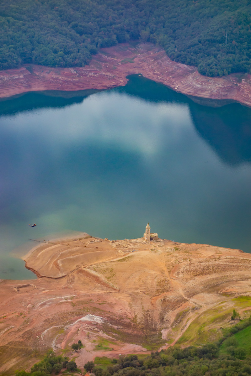 Desde aquí la perspectiva nos sitúa justo encima del pueblo emergido, con su iglesia y sus ruinas, justo en la orilla del pantano, donde hace muchos año pasaba el río Ter.