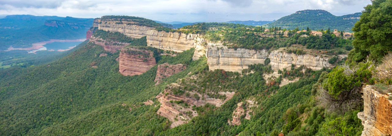 Justo a la derecha vemos el pequeño pueblo de Tavertet, justo al lado del precipicio del altiplano. Al fondo a la izquierda, contemplamos las aguas del embalse de Sau.
