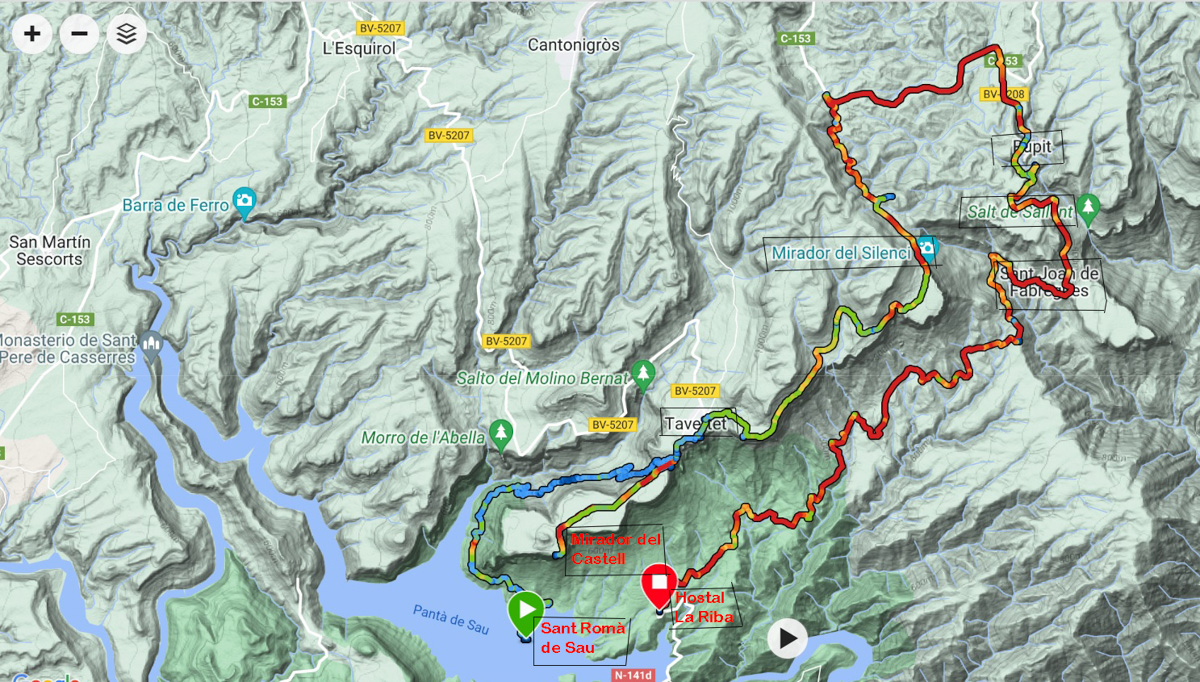 La ruta que he realizado es circular, con 37 km. de longitud y un desnivel total de 945 m., empezando y terminando en el Hostal La Riba. Desde aquí nos dirigimos al antiguo y renacido pueblo de Sant Romà, para luego tomar el camino que lentamente va subiendo hasta lo más alto de la peña, para llegar al mirador del Castell, después de 8 km. de una dura ascensión de 425 m. y más tarde seguir hasta el pueblo de Tavertet y seguidamente hasta Rupit. Luego, seguimos por la pista que directamente nos lleva de nuevo al Hostal la Riba, pasando por Sant Joan de Fabregues.
