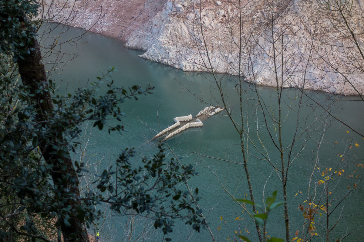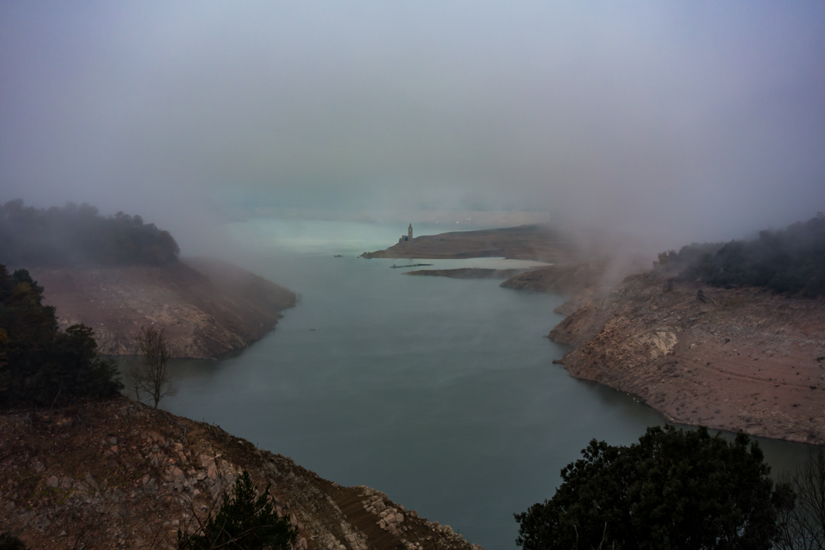 Saliendo de Vilanova a las 9 h. de la mañana, con mucha niebla y -2º c. de temperatura, pronto llegué a divisar el embalse de Sau, con la silueta de la iglesia emergida de las aguas a causa de la sequía, del antiguo pueblo de Sant Romà de Sau.