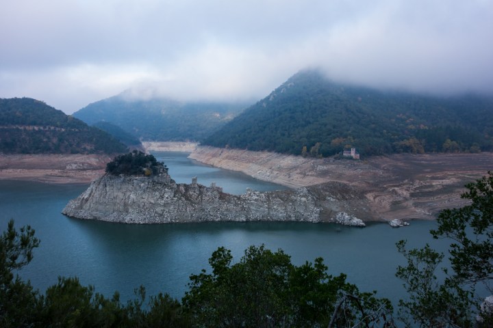 La presa del embalse de Sau presentaba esta triste imagen, con un 18% de su capacidad embalsada. La noche anterior había caído una fuerte tormenta. Algo es algo.