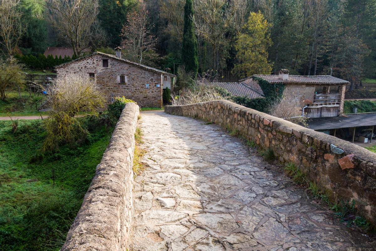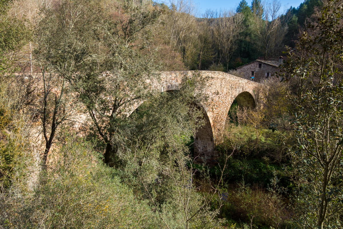Siguiendo por nuestra ruta alcanzamos el Pont medieval de Malafogasa, que cruzaremos sobre la Riera Major, cuyas aguas desembocan en el embalse de Sau. Justo al lado hay un camping y un restaurante.