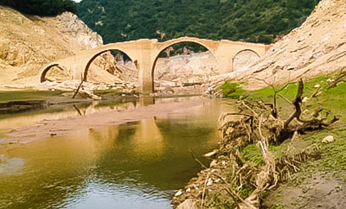 El embalse de Susqueda anegó totalmente el antiguo pueblo de Queròs, del que tan solo pude ver la parte alta del antiguo puente. A la derecha, el puente entero después de una antigua fuerte sequía.