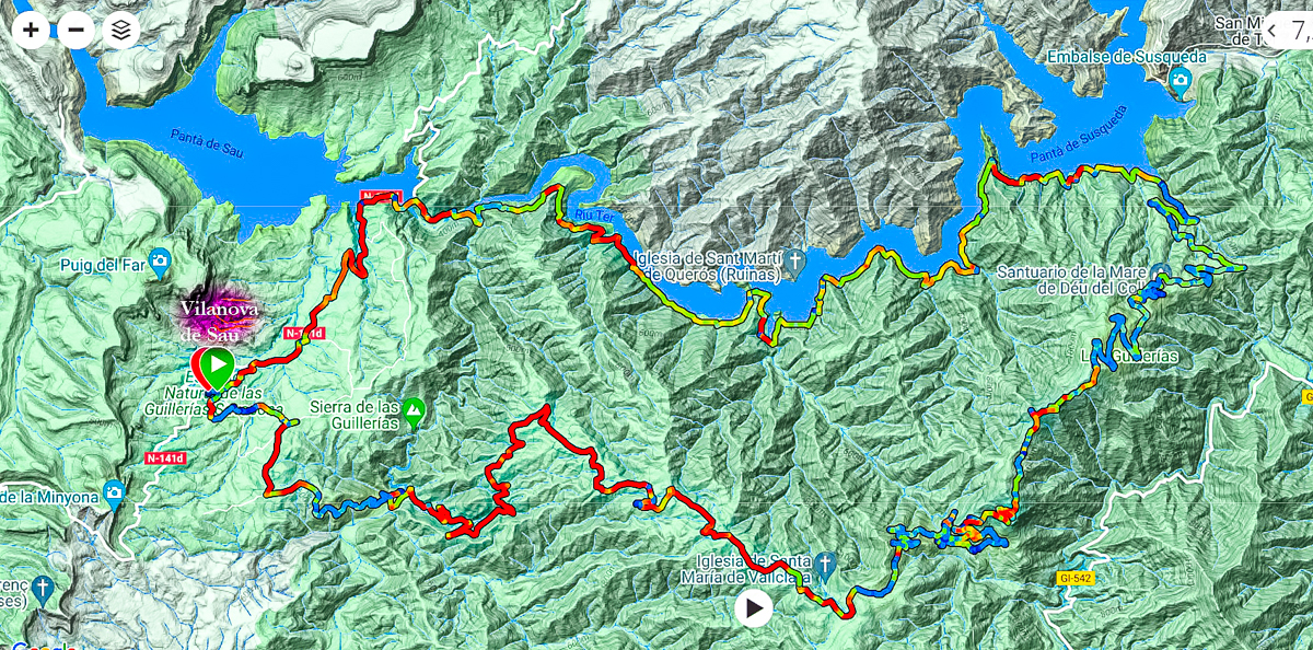 El itinerario empieza y acaba en Vilanova de Sau, pasando por la presa del Embalse de Sau, Pantano de Susqueda, Santuario de la Mare de Deu del Coll, Sant Benet, Collado de Fontsamallera, ermita de Sant Andreu de Bancells y el Pont de Malafogasa.
