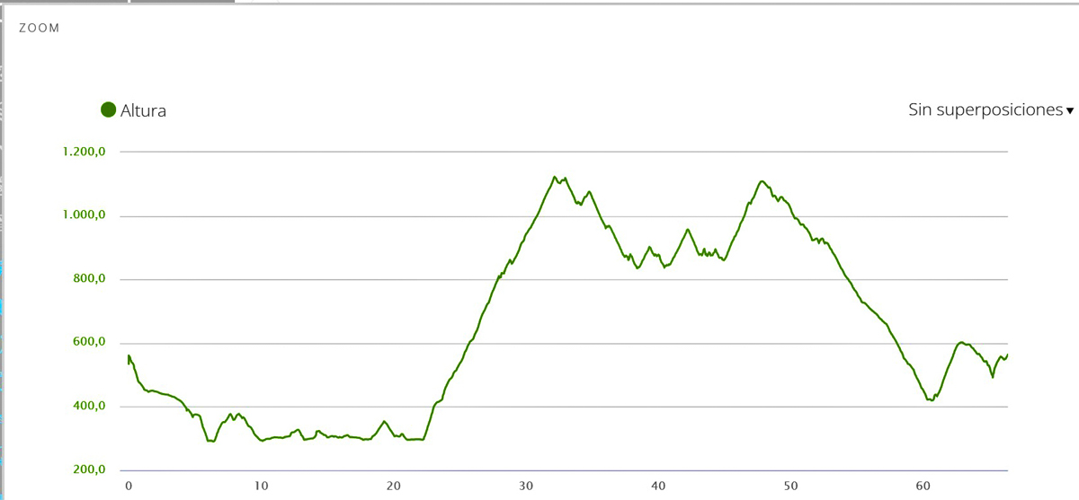La ruta tiene una longitud de 66,4 km. y un desnivel positivo de 1.935 m., con una dificultad técnica fácil, pero físicamente hay que estar bastante en forma. Se pasa de una altitud mínima de 360 m. a una máxima de 1.150 m. Quemé 2.900 calorías.