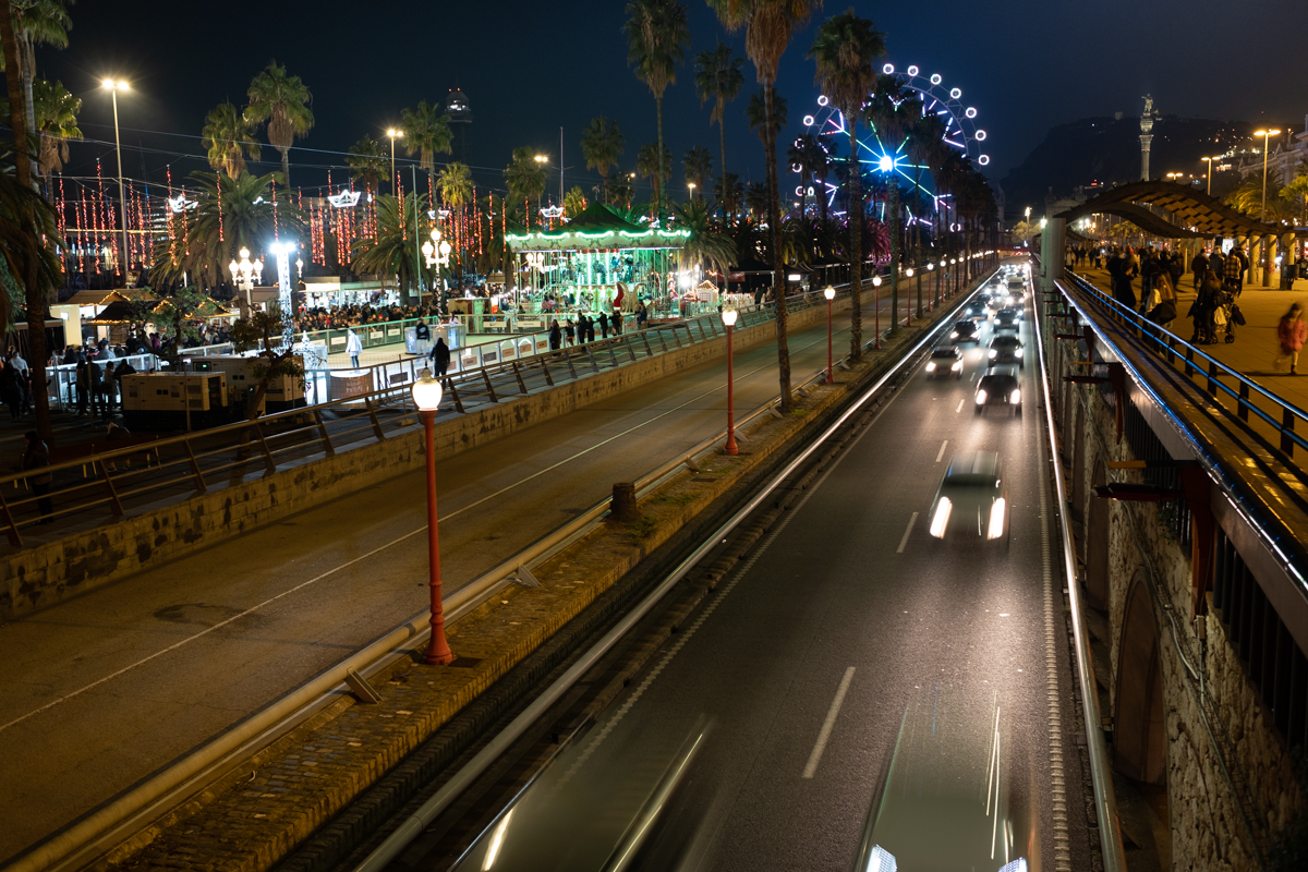 Desde el Paseo de Colón vemos girar al fondo, la noria gigante que, para estas pasadas fiestas, siempre se instala como principal atractivo del espectáculo de luces «Navidad en el Puerto». Más de un millón de personas la visitaron este año.