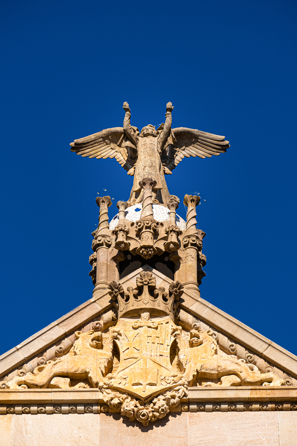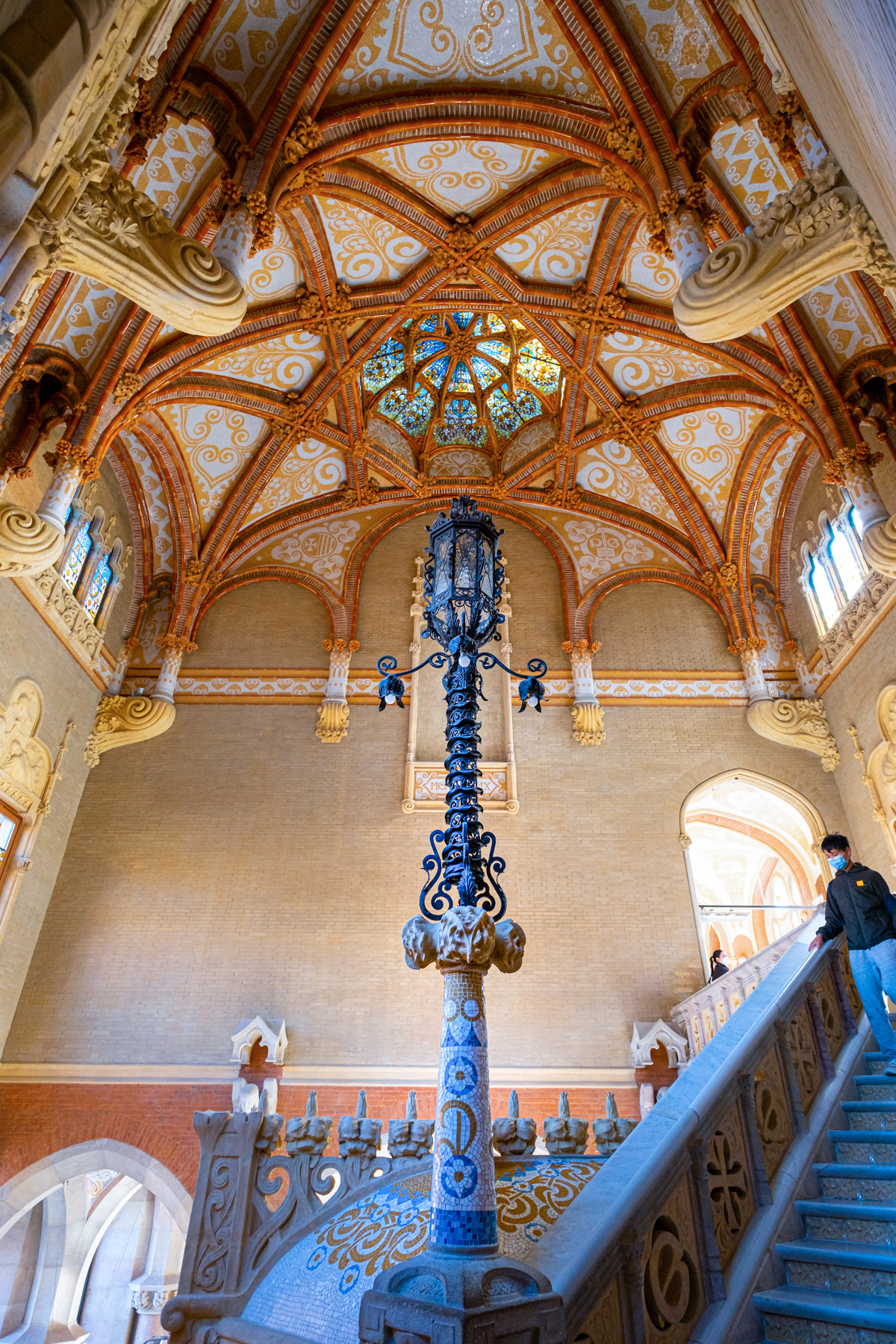 Antes de empezar la visita al recinto, nos encontramos con la escultura y homenaje a Pau Gil, el benefactor de esta gran obra. Seguidamente entramos en el gran edificio administrativo que antaño admitía a los pacientes, y nada más traspasar la gran puerta nos recibe el ostentoso estilo modernista de Lluís Domènech i Montaner. No es tan exagerado como en el Palau de la Música, la otra gran obra del arquitecto, pero estamos en un antiguo hospital, no en un palacio, por lo que llama aún más la atención la profusión decorativa que tienen las paredes, los techo y suelos.