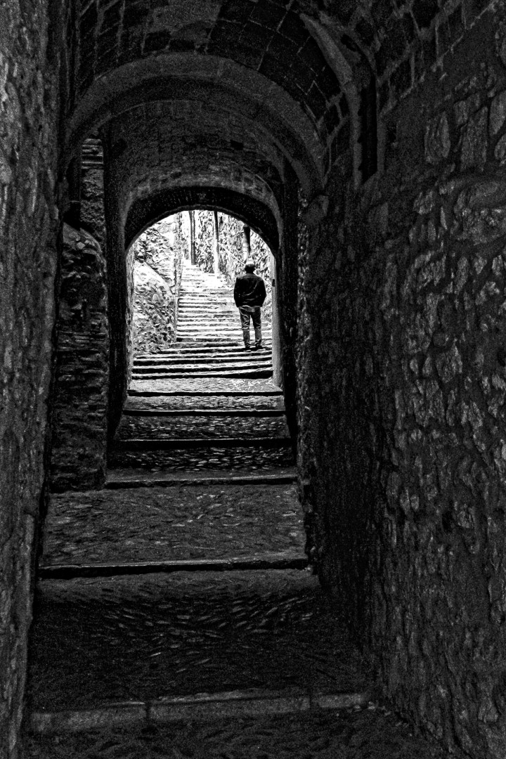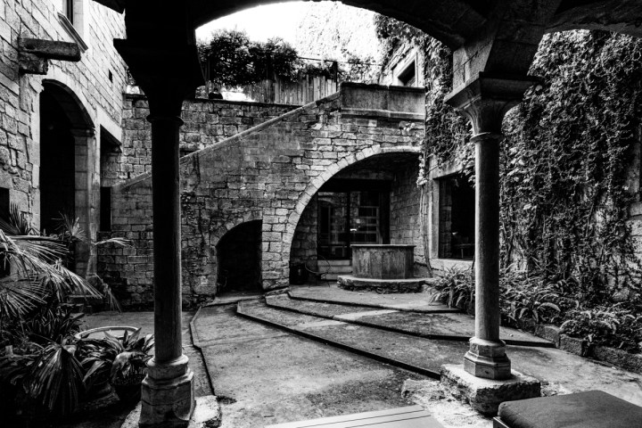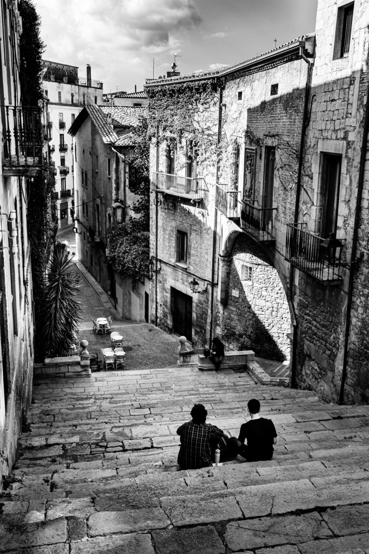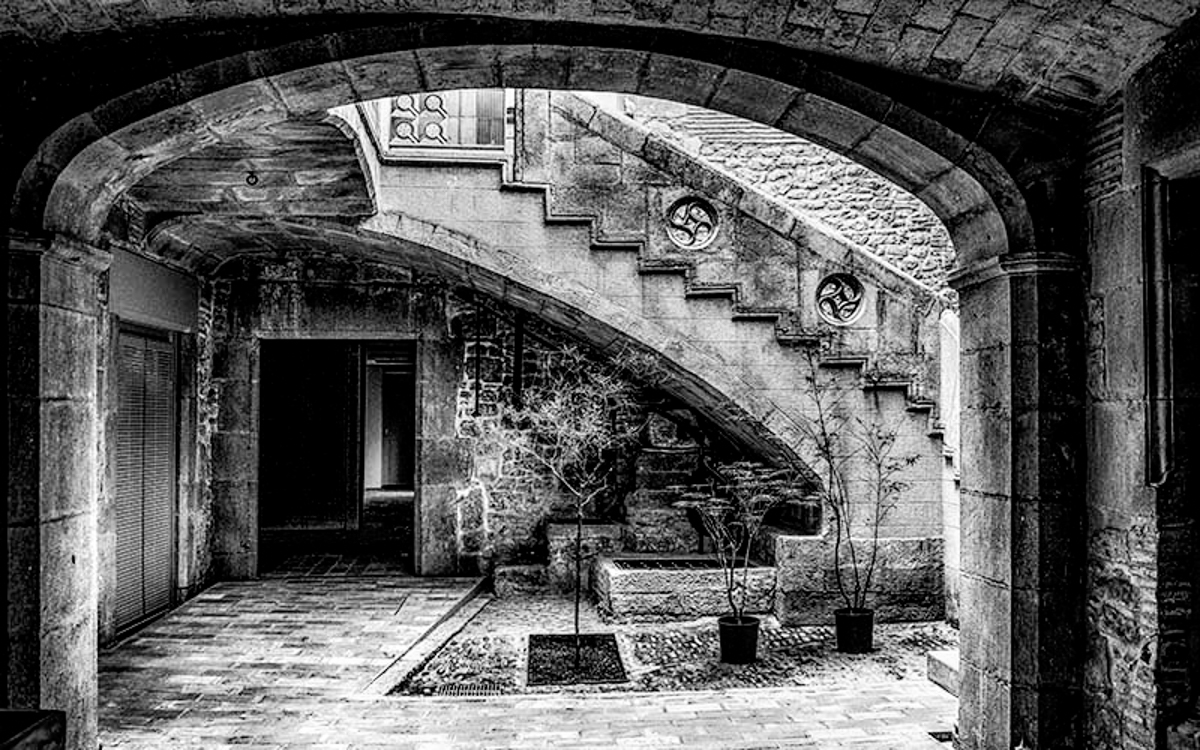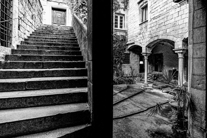 Visión desde el Convento de Sant Martí, de las escaleras barrocas que bajan hasta el arco sesgado, bordeando el Palacio Agullana