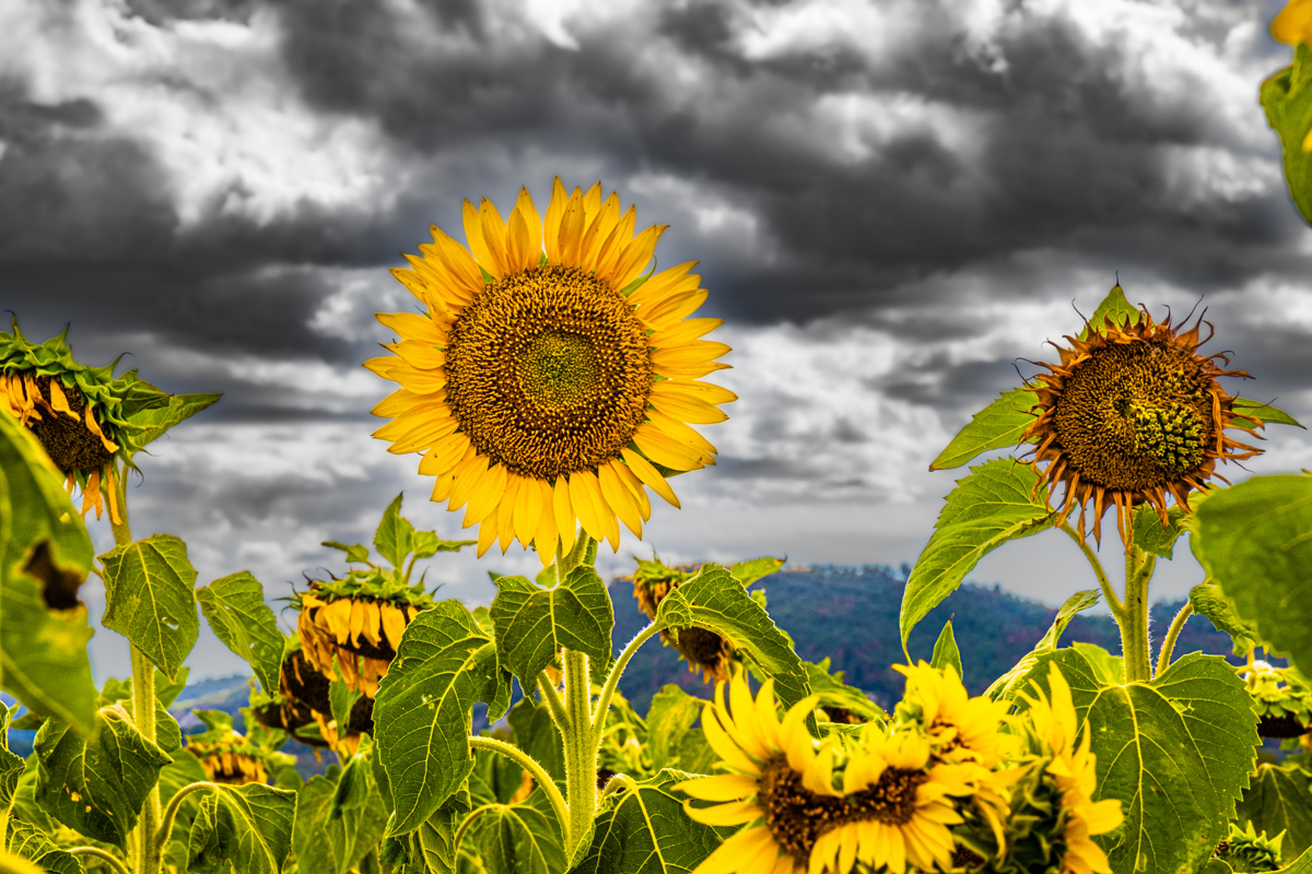 La primera imagen del girasol, en contraste con las nubes gris plomizo, me resulta impactante, cautivadora… Excepcional.