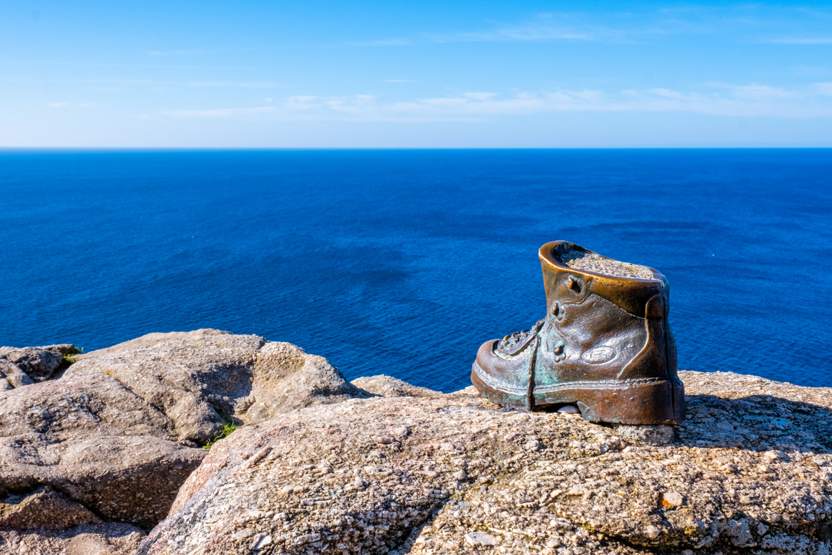 Un pequeño monumento en bronce, una bota de peregrino sobre una roca en el mismo Cabo Finisterre. Originalmente eran dos botas juntas, pero una la robaron. El monumento hace referencia a la ancestral tradición de los peregrinos de quemar las ropas usadas en la peregrinación y dejar las botas