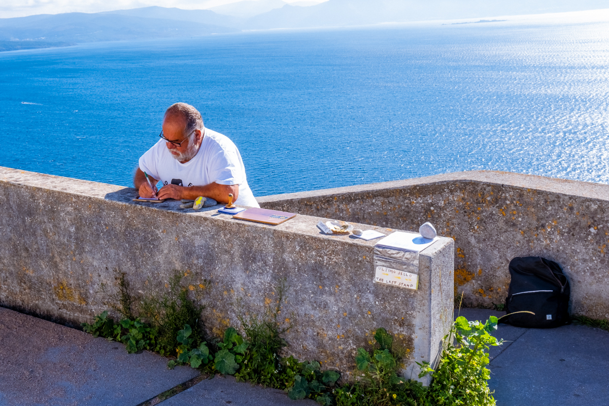 «Último sello» Se trata de un voluntario apostado en este margen, con todos los utensilios preparados para sellar la «Compostela» como prueba para los peregrinos de que han finalizado su Camino.