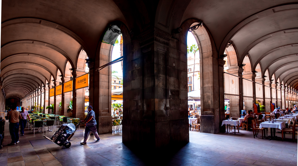 Aprovechando la estrechez de este conglomerado de estrechas calles en el barrio Gótico de Barcelona, pude captar mediante panorámica, estos tres puntos de fuga bien definidos.