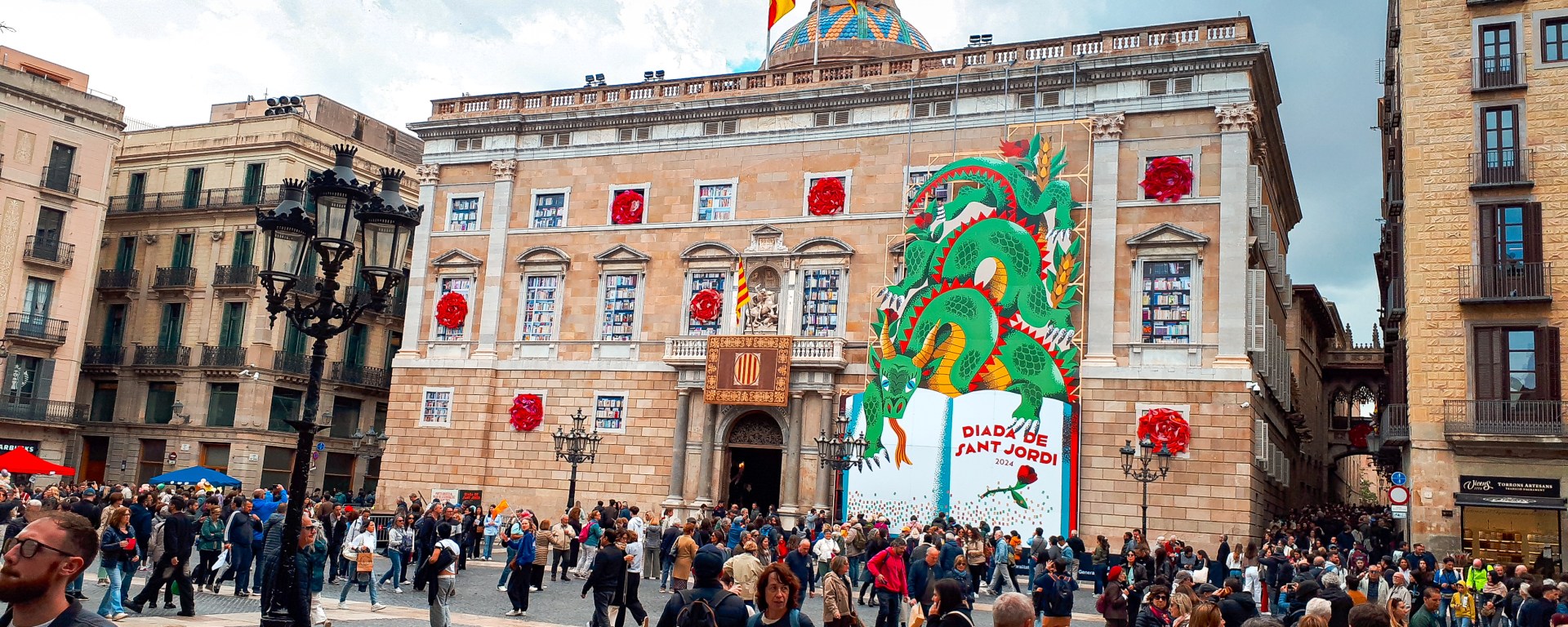 Este día tan especial, la casa Batllò se viste de gala adornando sus balcones con extensos ramilletes de rosas rojas. Creo que es el lugar más visitado de Barcelona en esta festividad.