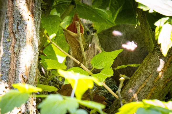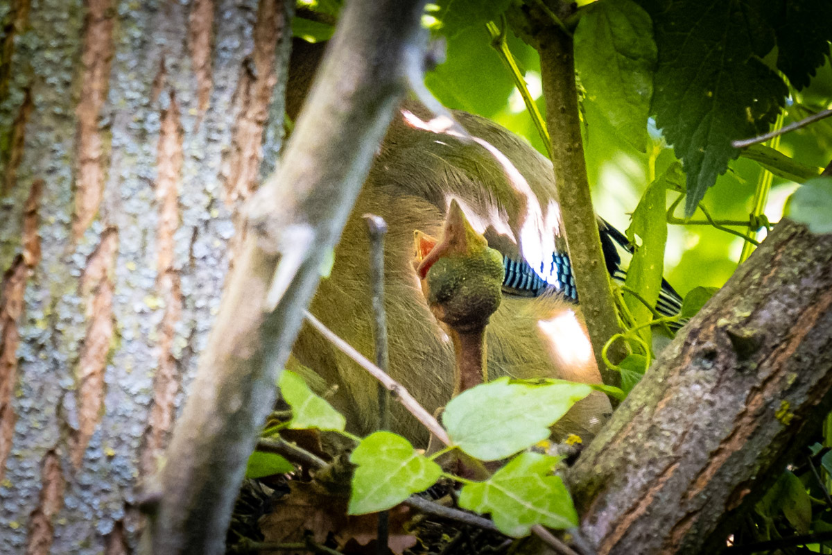 Por fin ya han nacido los polluelos de Arrendajos Todo se inició cuando desde la ventana de la cocina, a una distancia de unos 4 metros, observé que una pareja de Arrendajos emprendían la labor de la construcción de un nido, aportando diferentes tamaños de ramitas, cada vez más finas hasta completar el nido. Durante varias semanas he estado siguiendo toda la evolución de esta conmovedora historia. Ahora los padres no paran de llevarles la comida que reclaman las hambrientas crías, ahora ya, con los ojos abiertos.
