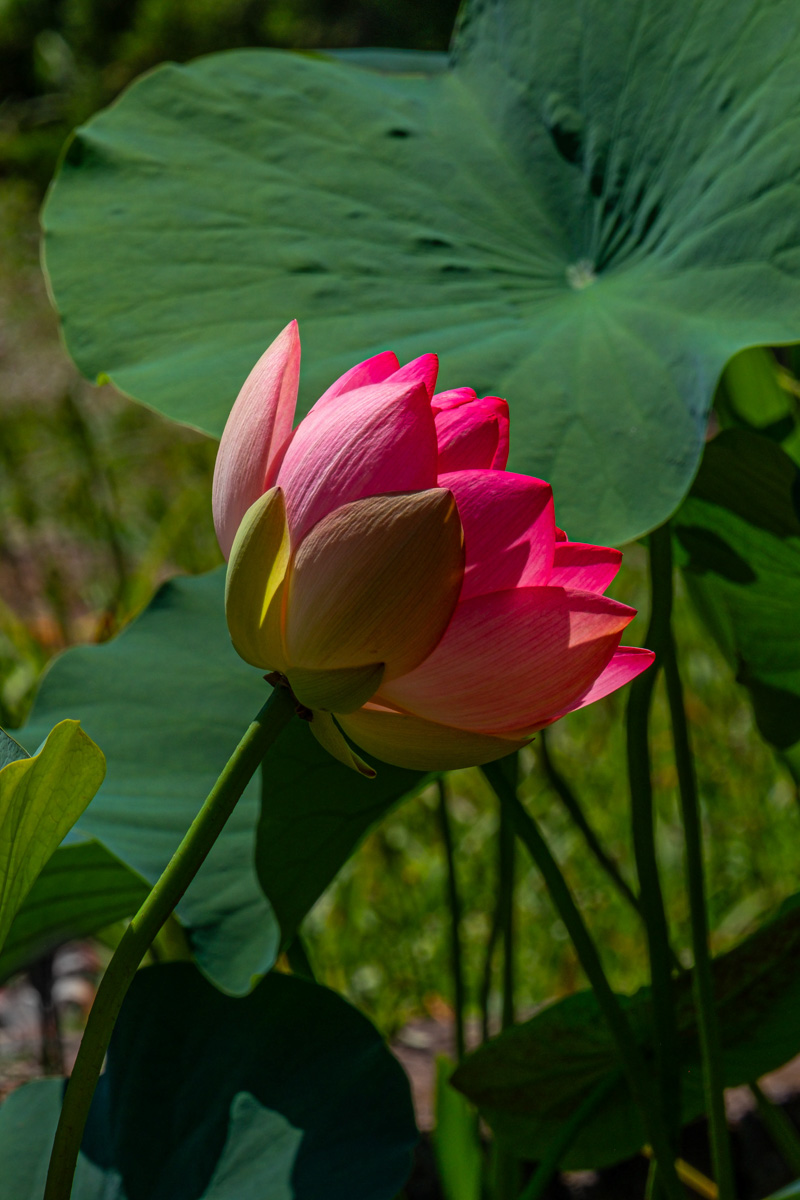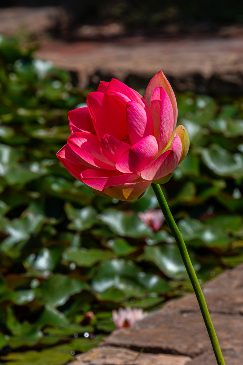 La flor de loto es acuática por naturaleza, por lo tanto, la planta crece en la superficie de estanques y lagunas, con sus hojas redondas flotando o emergiendo del agua.