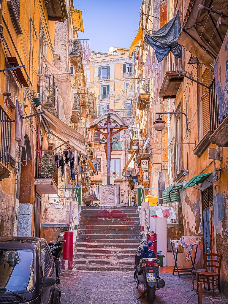 Porque este es, sobre todo, un barrio bullicioso que retrata a la perfección la postal de tópicos de Nápoles: una vecina que te saluda, otros que parecen haberse puesto de acuerdo para tender la ropa recién lavada, la mamma que se asoma a la ventana profiriendo gritos para que los niños suban a comer o los ciclomotores en los que, sin límite de edad de los conductores, la única norma es no llevar casco….