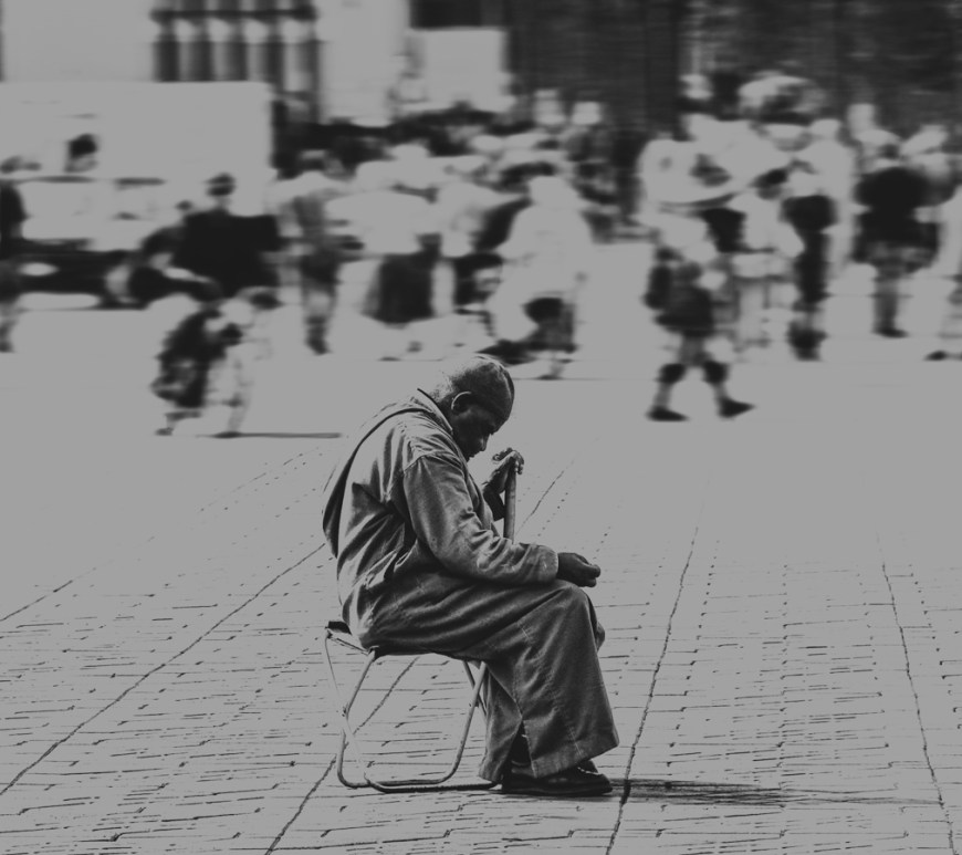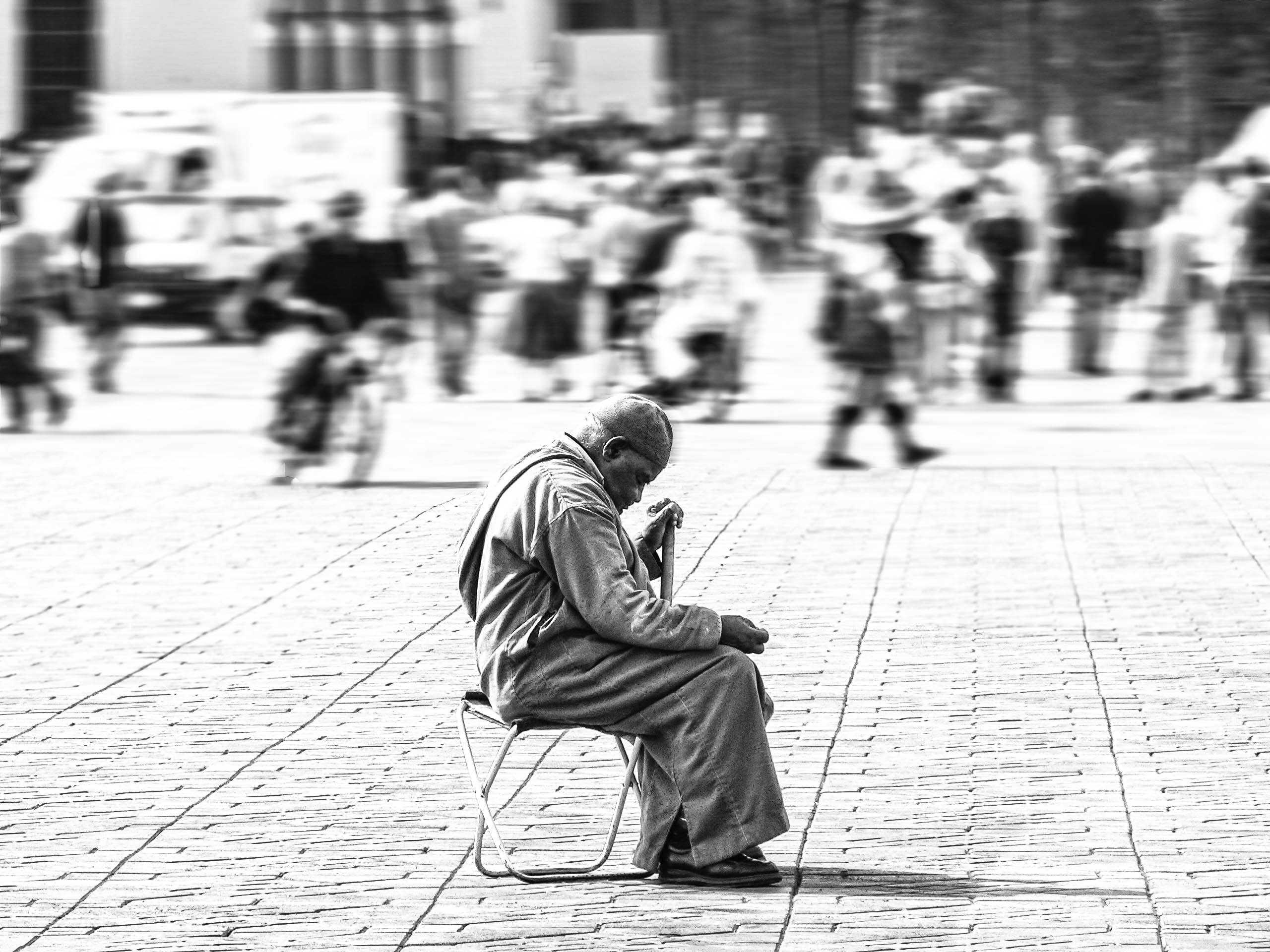 Plaza de Yamaa el Fna, Marrakech. Un mendigo ciego pide limosna en medio del caos.